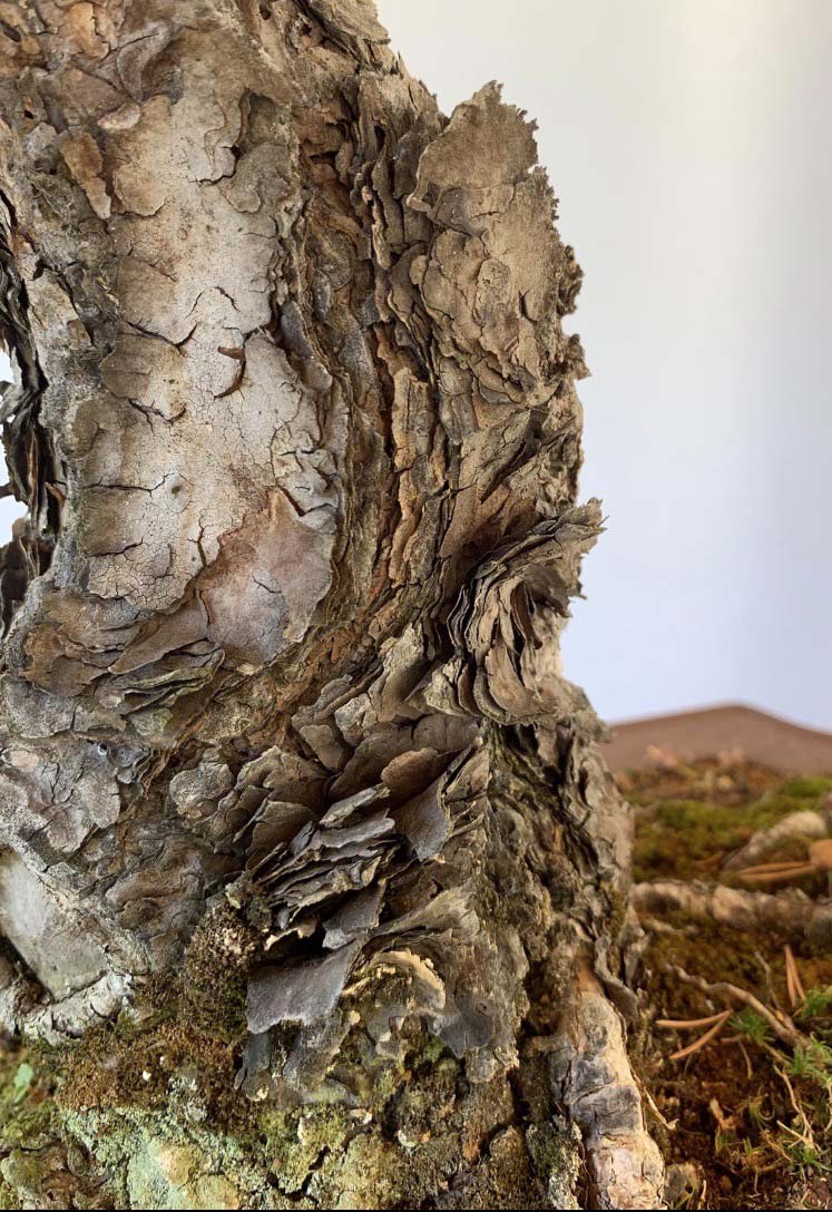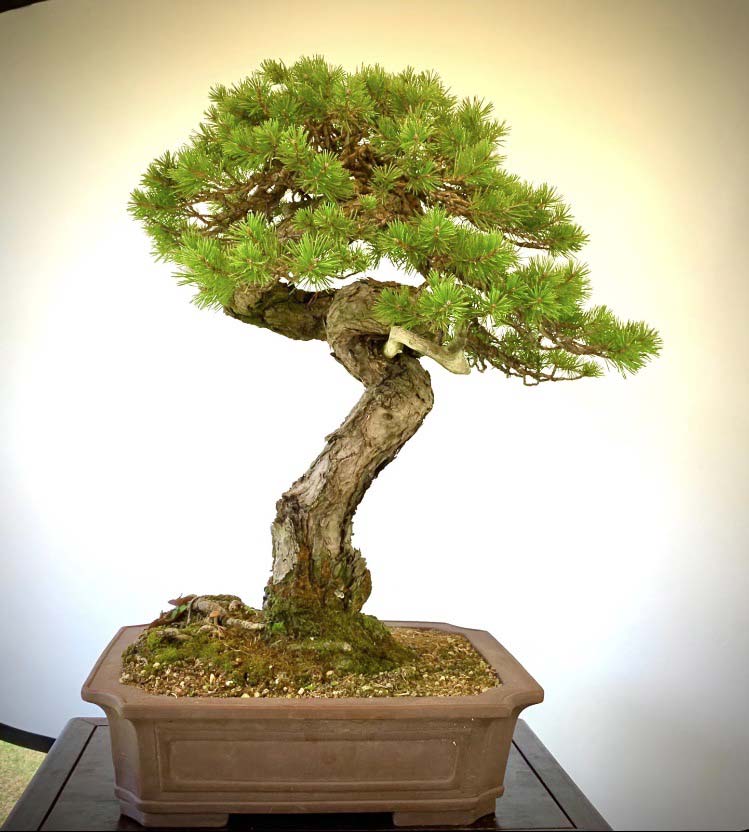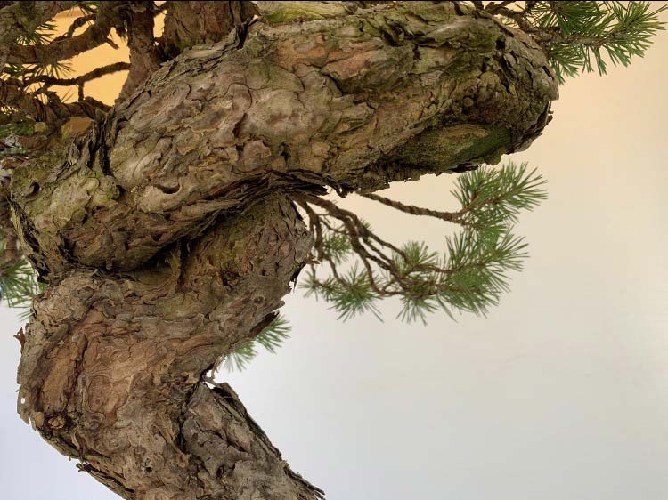 Pino silvestre in stile bunjin, presenta un’elegante contorsione del tronco, sormontata dai rami piegati verso il basso a donare un aspetto maturo.
