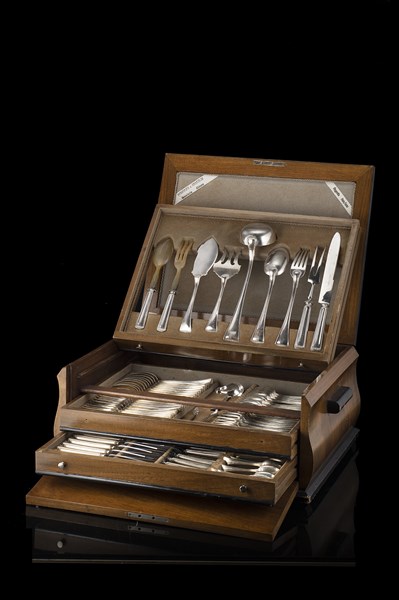 A silver flatware set, composed of: twelve forks, knives, spoons, dessert forks, dessert knives, dessert spoons, coffee spoons and eleven serving pieces. Titled 800. Silversmith Cesa (g 4700) Wooden case (defects)
