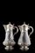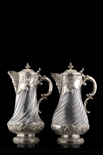 Coppia di brocche in cristallo con ghiere, basi, coperchio e ansa in argento sbalzato e cesellato a tralci fioriti e volute, prese dei coperchi a ricciolo a tutto tondo. Londra, 1891. Argentiere EB (h. cm 33) (difetti)