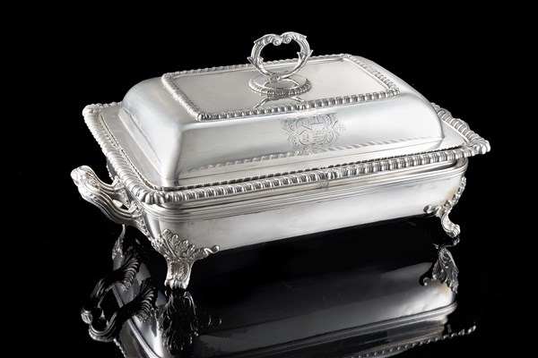 Legumiera con coperchio in argento. Corpo di forma rettangolare con superficie liscia decorata da bordure godronate e conchiglie, armi nobiliari incise. Londra, 1809, Paul Storr (attr.) unito a scaldino in Old Sheffiel Plate (cm 31x22,5) (g 2087 ca.) (lievi difetti)