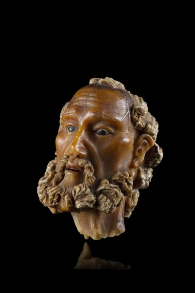 Arte napoletana, secolo XVII/XVIII "Testa di San Giuseppe" in ceroplastica policroma con occhi in cristallo. La figura rientra nella gamma dei gruppi della Natività, modellati anche per la devozione privata quotidiana e sistemati dentro teche con cristalli, dette "scarabattole". La cera qui proposta è attribuibile alla scultrice Caterina de Julianis (notizie dal 1695 al 1742) (h. cm 10) (difetti)