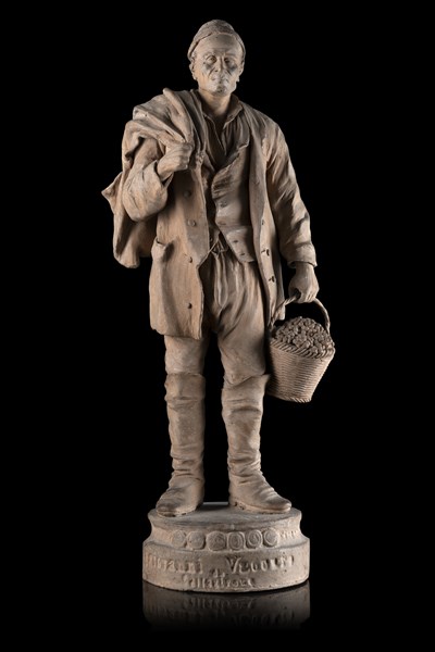 Workshop of Bongiovanni Vaccaro, Caltagirone, 19-th century "Peasant carrying basket with grapes" a monochrome terracotta figure. Expertise by Gennaro Borrelli, Naples, October 1988