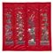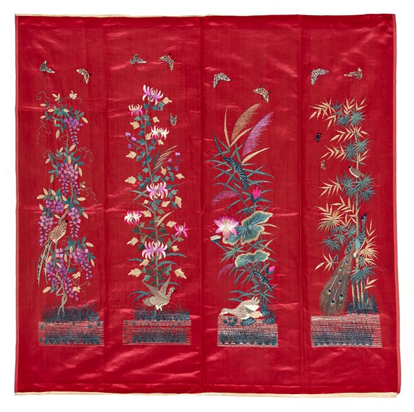 Ricamo in seta policroma su fondo di raso di seta rossa raffigurante volatili, rami di bambù, fiori di loto, crisantemi e rami di glicine suddivisi in quattro riserve rettangolari. Fodera in cotone con stampato in oro probabile numero del disegno, dimensioni e simbolo della ditta produttrice. Cina, fine secolo XIX (cm 128x141) (lievi difetti)