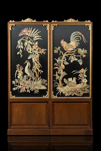 Paravento a due ante in mogano con profili e cimasa intagliati e dorati. Ante decorate da due pannelli in tessuto a fondo nero ricamati in seta con rami fioriti e volatili in policromia. Secolo XX (cm 164x120) (difetti)