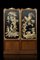 Paravento a due ante in mogano con profili e cimasa intagliati e dorati. Ante d