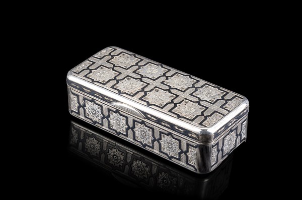 Scatola rettangolare in argento inciso a fiori e niellato, interno in vermeille. Punzoni russi, secolo XIX (cm 9x2,4x4) (g 118) (difetti)