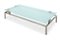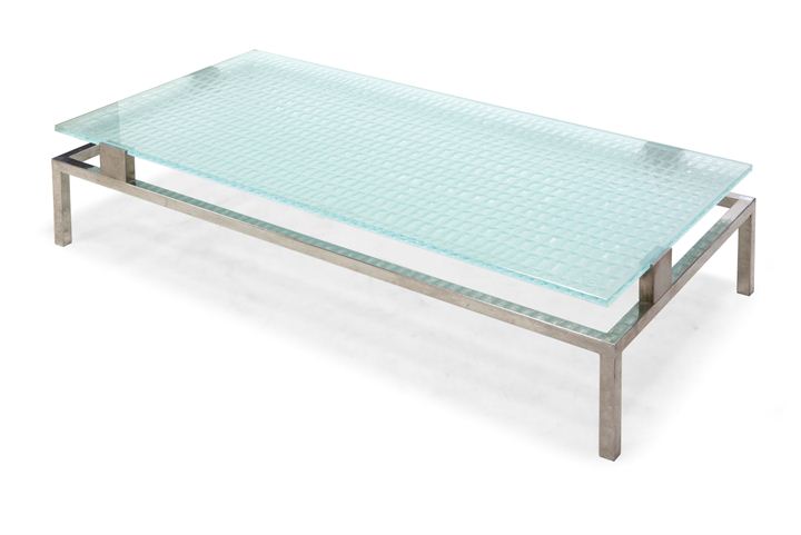 Tavolino con piano in cristallo inciso ad acido, base in acciaio inossidabile.