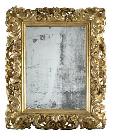 Specchiera in legno intagliato e dorato a volute e motivi floreali. Secolo XVIII (cm 95x117) (difetti e restauri)