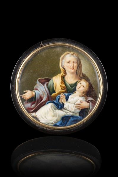 Tabacchiera di forma circolare in tartaruga, coperchio con miniatura raffigurante Sant' Anna e la Vergine entro cornice in oro. Secolo XVIII (d. cm 8,3) (difetti)