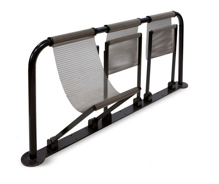 Elemento di arredo urbano costituto da tre sedute apribili su entrambi i lati in maglia di acciaio inossidabile.