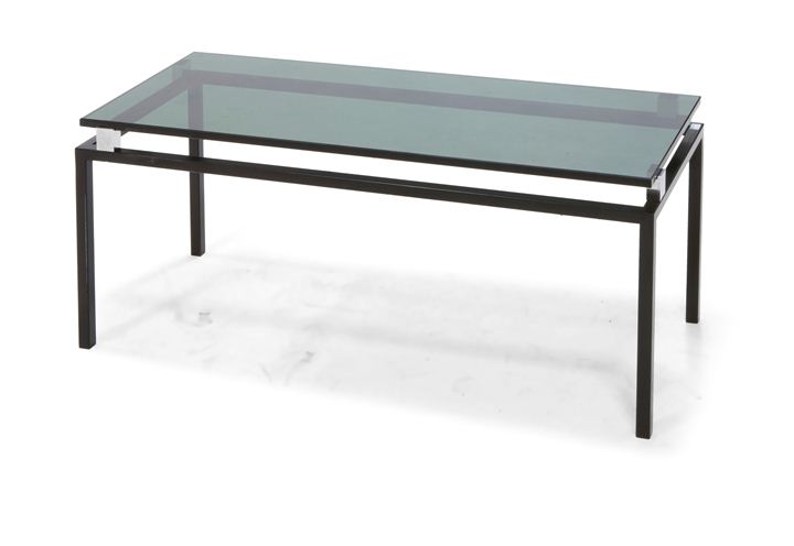Tavolino in cristallo fumè spessore mm 15, struttura in metallo laccato nero e staffe cromate.