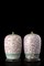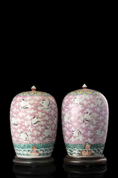 Due potiches in porcellana a fondo rosa decorate a motivo di gru tra nuvole, basi in legno (coperchi probabilmente del periodo successivo) (lievi difetti)