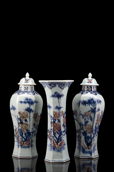 Un vaso e due potiches di forma esagonale in porcellana celadon decorata con rami blu e fiori rosso ferro (restauri)