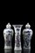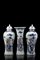 A celadon hexagonal porcelain set, comprising a vase and two potiches, decorated with blue and iron red blossoming branches (restorations)