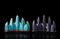 Due poggia pennelli a forma di montagna con cinque punte, uno a smalto viola, l'altro a smalto turchese, con basi in legno