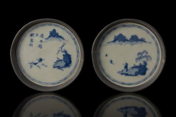 A pair of small blue and white porcelain dishes, with pewter mounts, “Wang Dong Shi Zhao“ mark