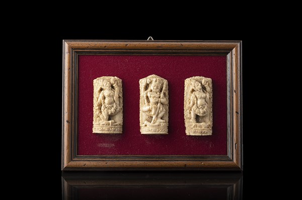 Tre sculture in avorio intagliato raffiguranti Shiva su pannello in velluto, in un'unica cornice