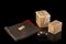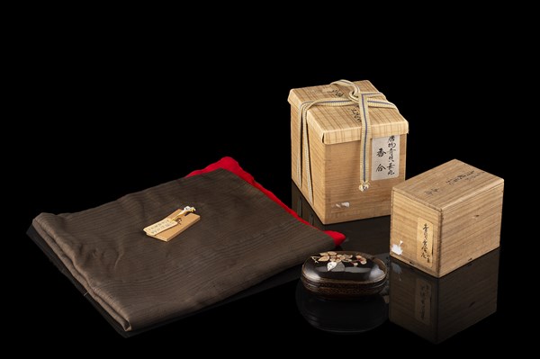 Piccola scatola ovale laccata in nero (luotian) e dipinta in oro (miaojin), il coperchio decorato in madreperla con rami di pruno in fiore, con dettagli in lacca rossa e lumeggiature, il bordo adornato dal classico motivo 'dell'erba profumata' (xiangcao), con contenitore originale (difetti e mancanze)