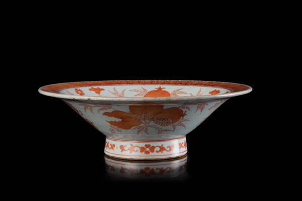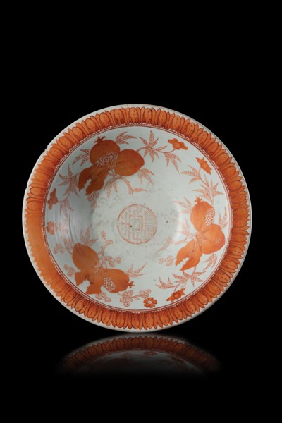 Lotto 1051 | Ciotola in porcellana bianca con decoro rosso ferro decorata a pesche, melogran