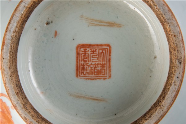 Ciotola in porcellana bianca con decoro rosso ferro decorata a pesche, melograni e pipistrelli, marchio Guangxu (difetti)