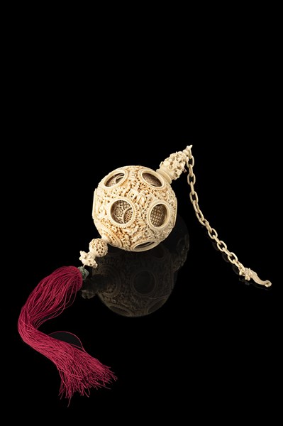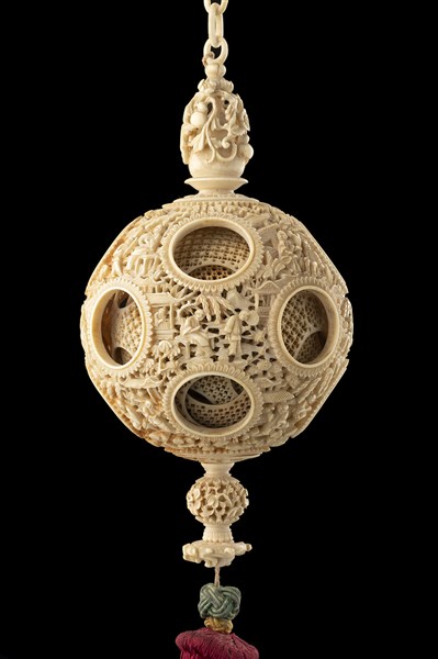 Gioco di sfere in avorio intagliato e traforato, la sfera esterna intagliata a figure, pagode e tralci d'albero, le sfere interne a motivi geometrici