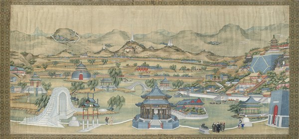 Grande dipinto su seta applicato su carta raffigurante veduta del Palazzo d'estate presso Pechino (difetti)