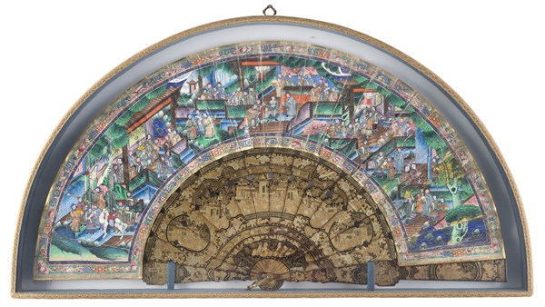 Ventaglio con stecche in tartaruga riccamente decorate con scene animate dorate, pagine in carta dipinta con personaggi con facce in porcellana, in bacheca