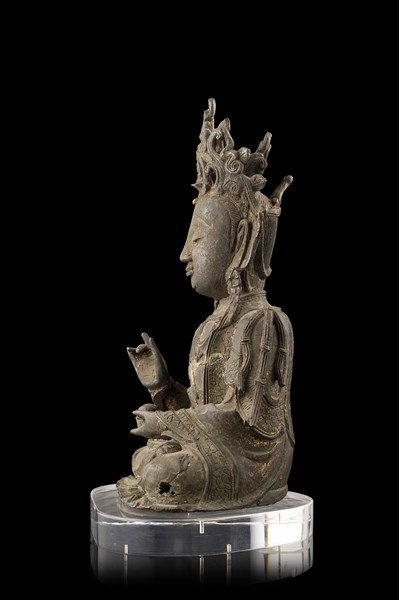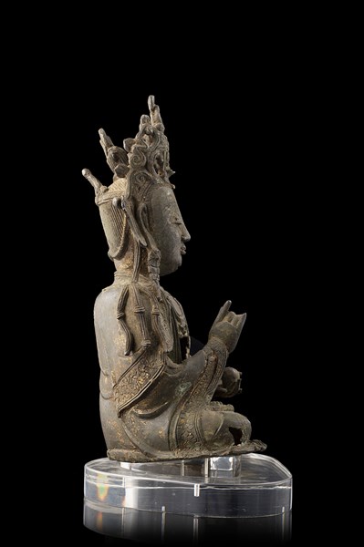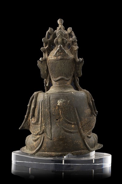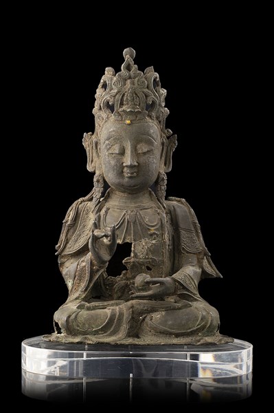 Figura di Buddha in bronzo brunito e parzialmente dorato, base in plexiglass (gravi difetti)