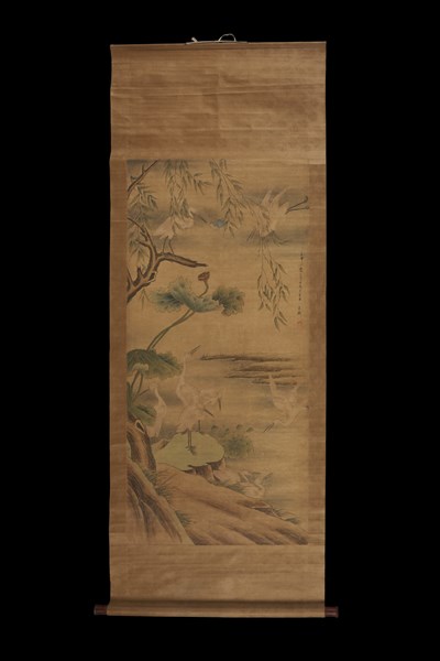 Scroll inchiostro e colore su carta nello stile di Wang Yuan raffigurante gru in paesaggio lagunare (difetti)