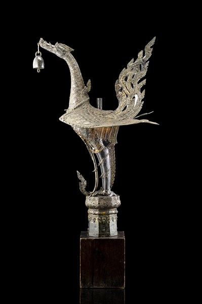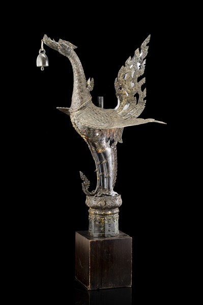 A bronze winged dragon holding a bell, on wood stand (defects and restorations)