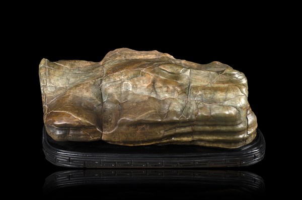 Blocco di roccia in giadeite scolpita e levigata dalla natura, montata su base in legno sagomata. Gonjin, Cina