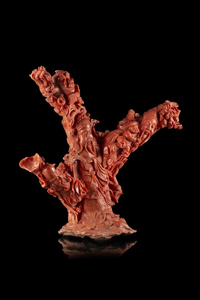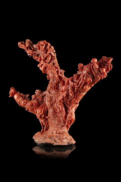 Lotto 1116 | Grande scultura in corallo finemente scolpita a figure di saggi con bambini fra