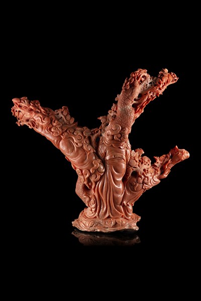 Grande scultura in corallo finemente scolpita a figure di saggi con bambini fra tralci fioriti, frutti e gru (difetti)