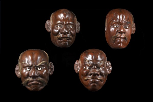 Lotto 1118 | Quattro maschere Kabuki in cartapesta, vetro e stucco (difetti e mancanze) Giap