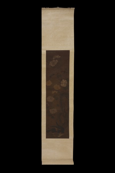Scroll verticale su tela raffigurante coppia di uccelli con sfondo floreale, reca iscrizione (difetti)