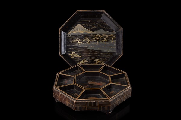 An octagonal lacquered wood box, painted with geomatrical patterns and birds among shrubs, concealing nine trays inside and painted with a view of the Fujiyama under the cover (defects and losses)