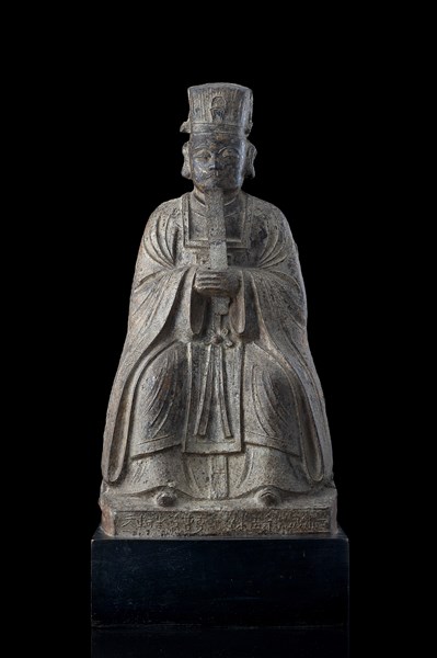 A cast iron seated figure of an hell's judge holding a hu tablet, inscribed at the back and on the front base, on a later wood base