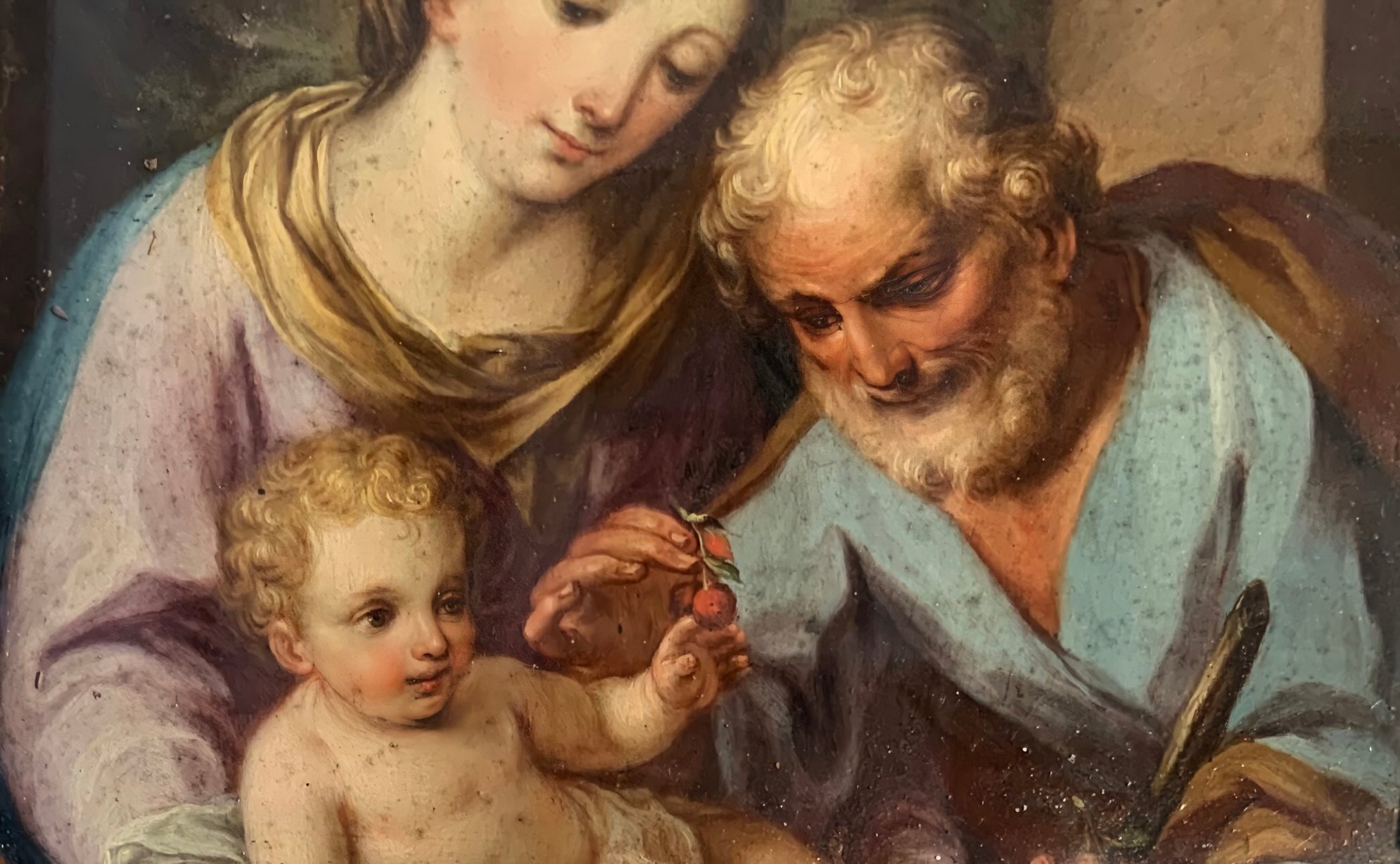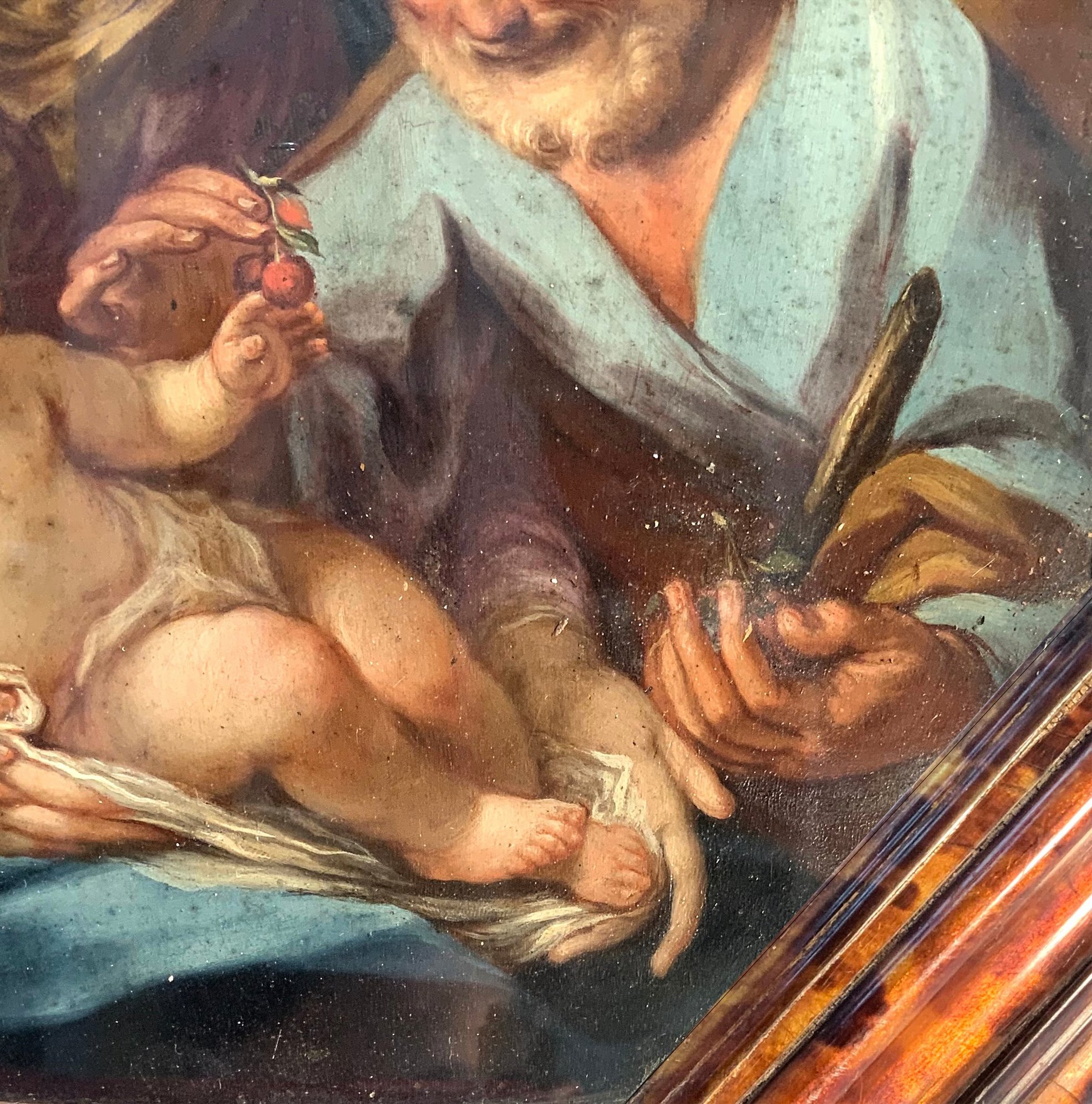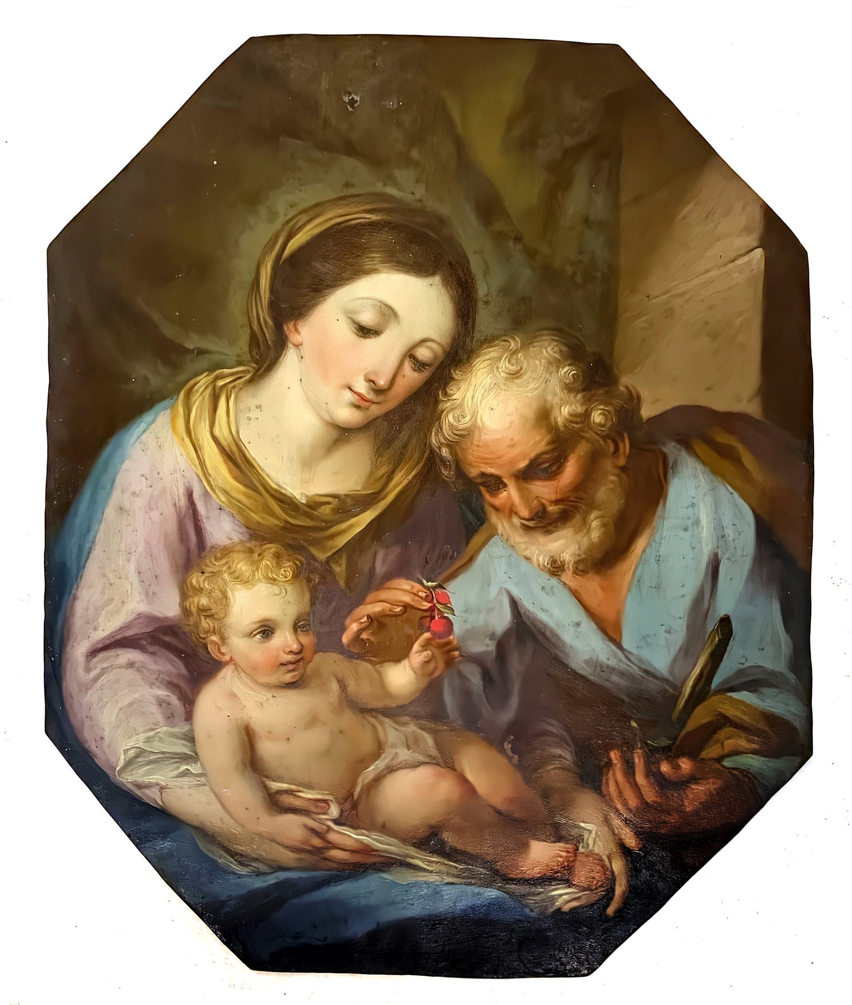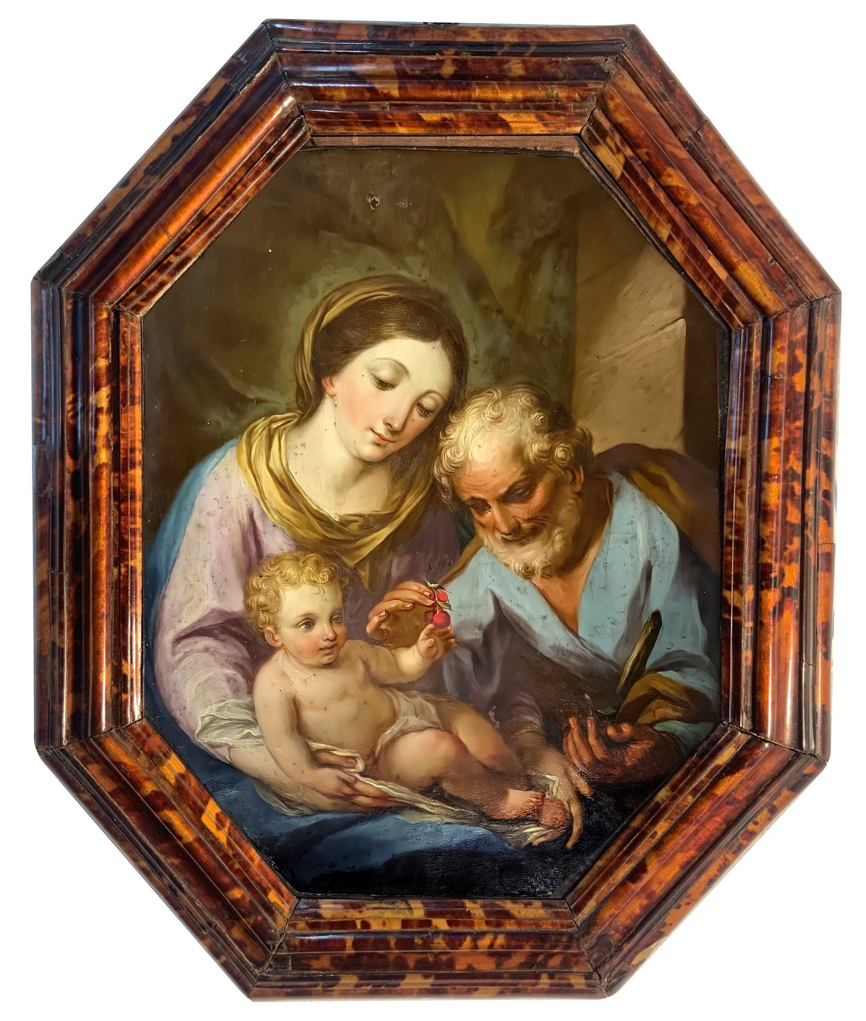 Dipinto ad olio su rame ottagonale (ribattuto a mano) raffigurante Sacra Famiglia delle ciliegie, metà del XVII secolo, attribuito a Elisabetta Sirani (Bologna, 1638 – Bologna, 1665). In cornice ottagonale in tartaruga antica. Cm 29,5x22,5. Con cornice cm 38x31.