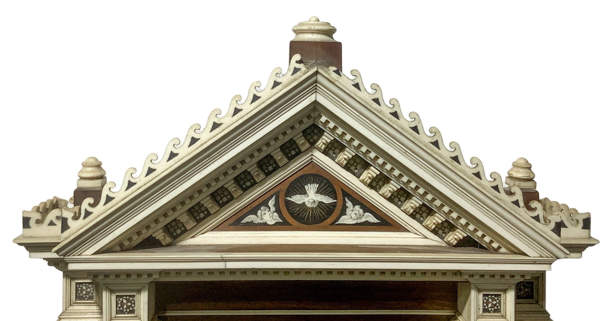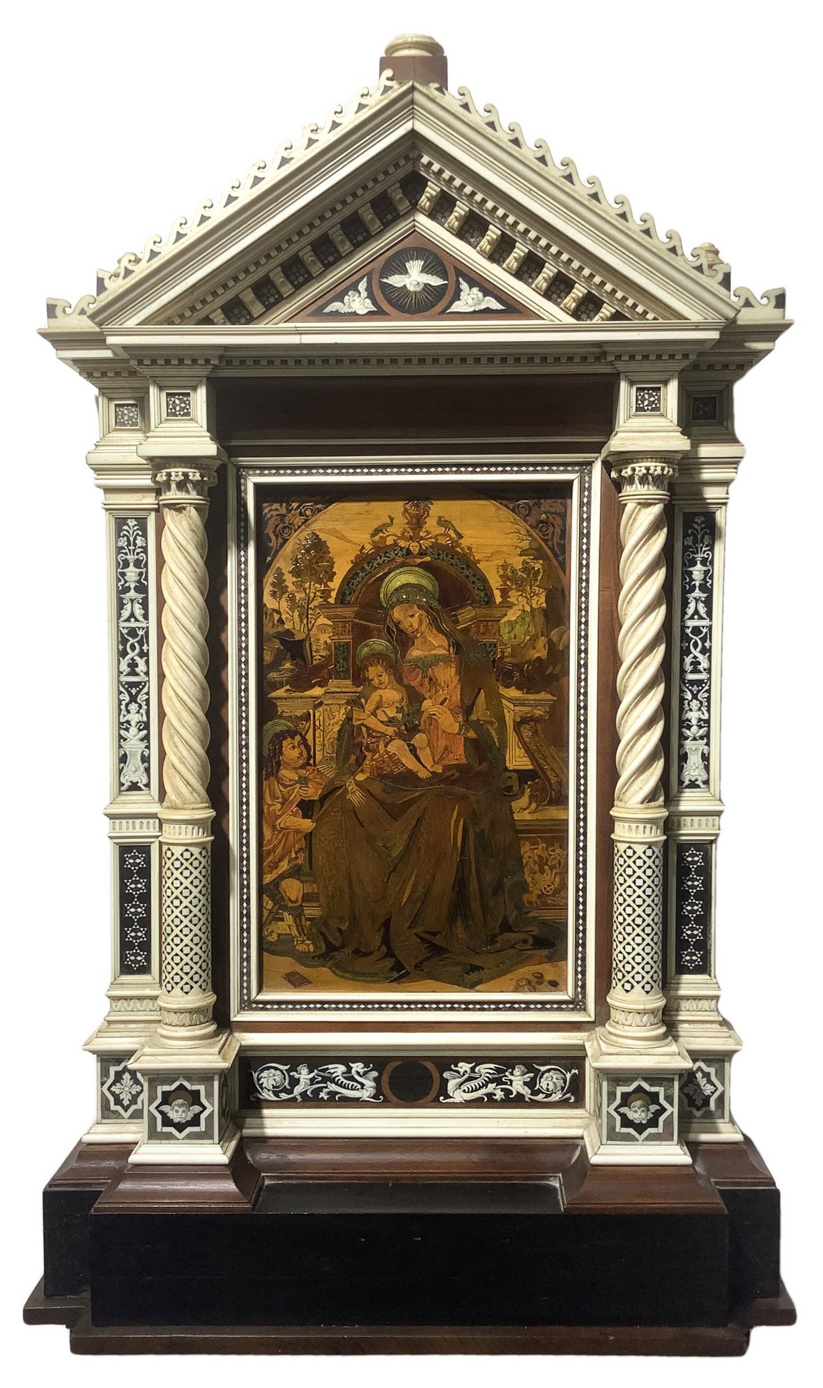 Piccola edicola/ancona in legno, avorio e madreperla, Alessandro Monteneri (Perugia 1832-1920). All'interno mosaico ligneo in scala assonometrica in legno raffigurante Madonna in trono con bambino e San Giovannino. Firmata sul retro Alessandro Monteneri di Perugia e datata 1879. H cm 64. Larghezza cm 34. Profondità cm 10