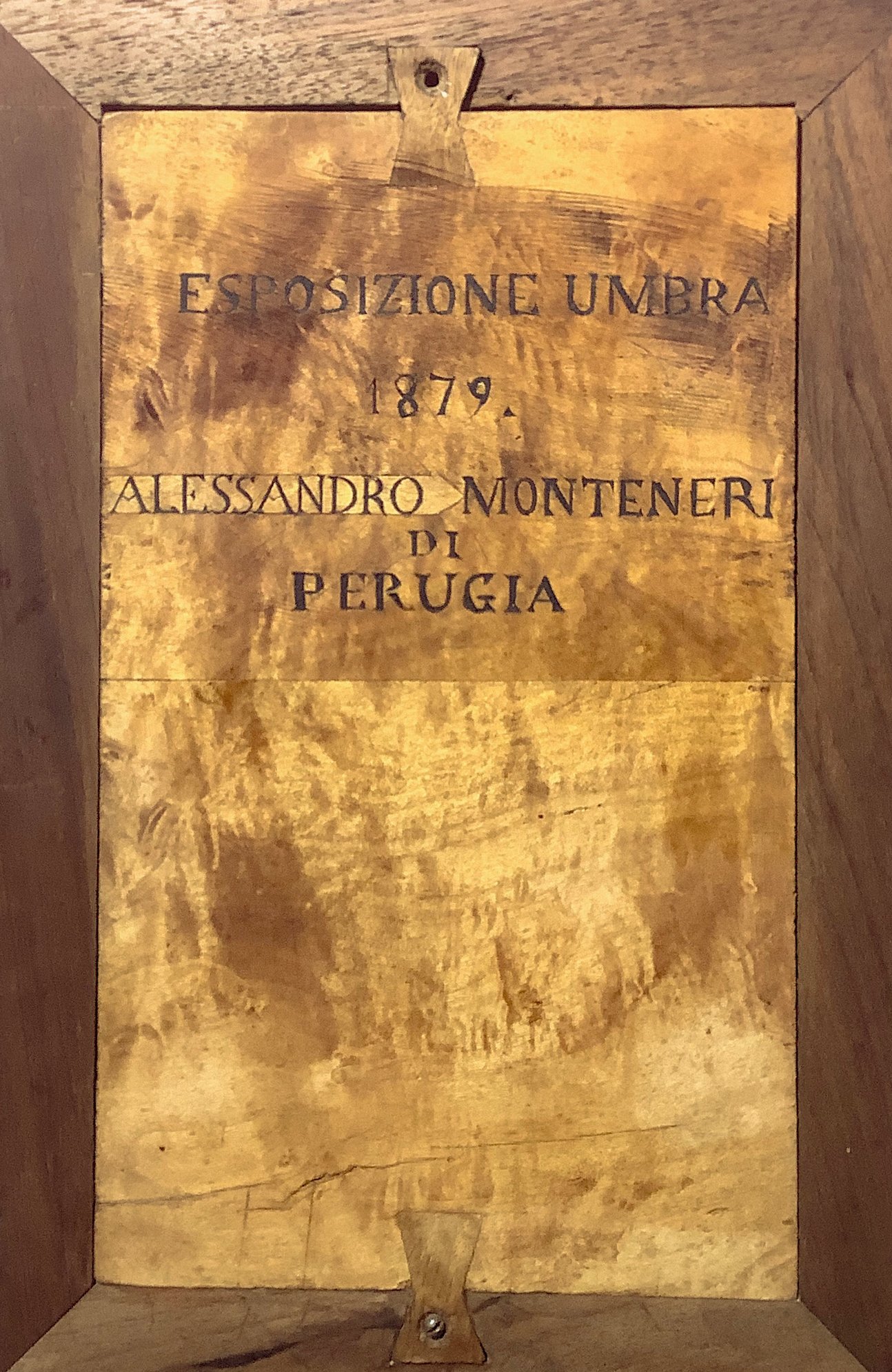 "Alessandro Monteneri, noto intarsiatore perugino, toccò esiti di grandissimo rilievo, sotto il profilo tecnico ed esecutivo, negli anni in cui lo stile neorinascimentale storicista, specie in Italia, conobbe straordinaria auge e vide protagonisti, alle esposizioni nazionali e internazionali, una folta schiera di grandi nomi: il Gatti di Faenza, i f.lli Falcini di Firenze, i Gargiullo di Napoli, il Lancetti di Siena.