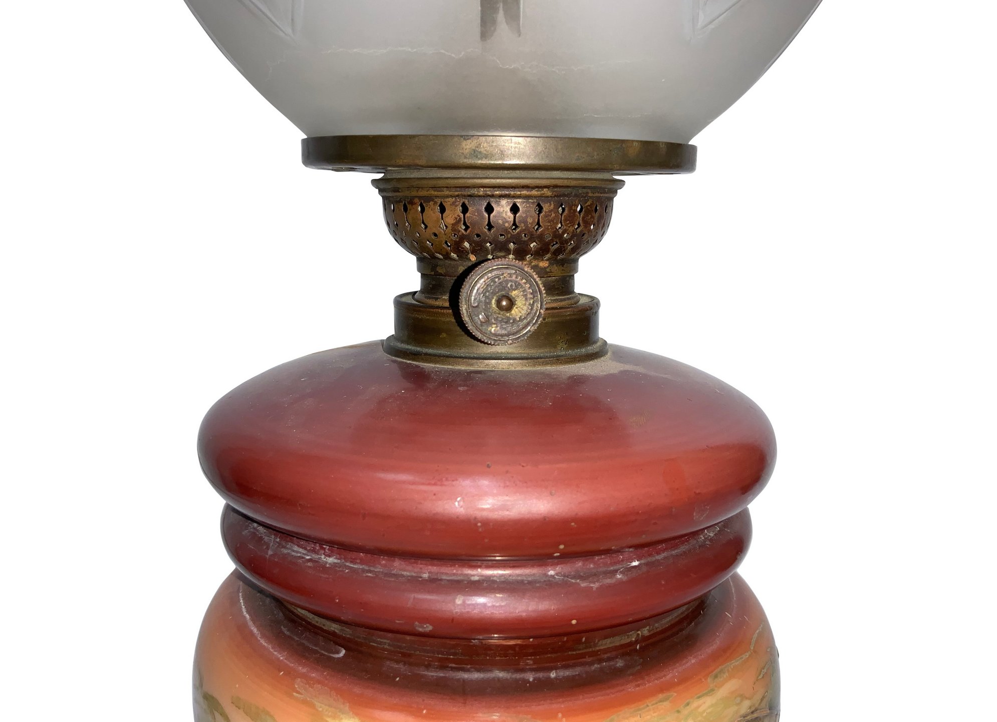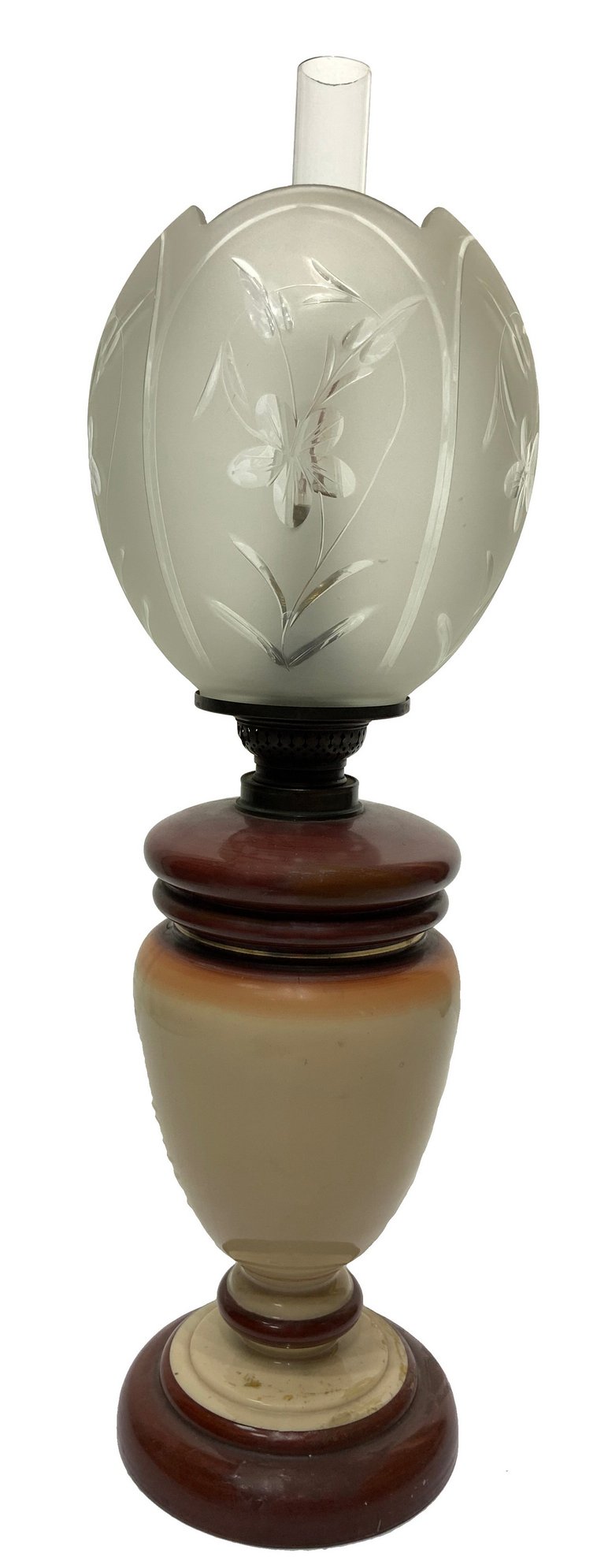 Lume a petrolio con decori di pavoni e coppa in vetro con incisioni floreali, XX secolo. H cm 56.