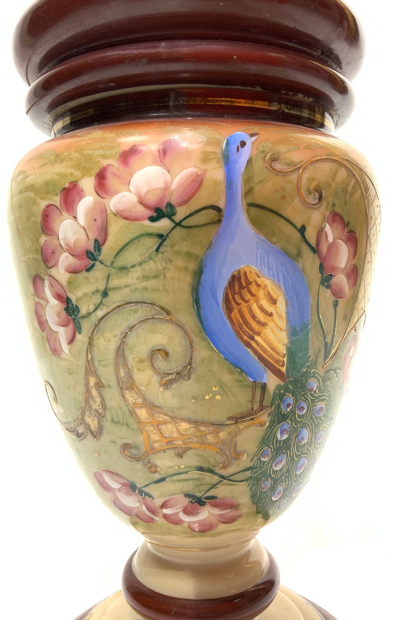 Lume a petrolio con decori di pavoni e coppa in vetro con incisioni floreali,...