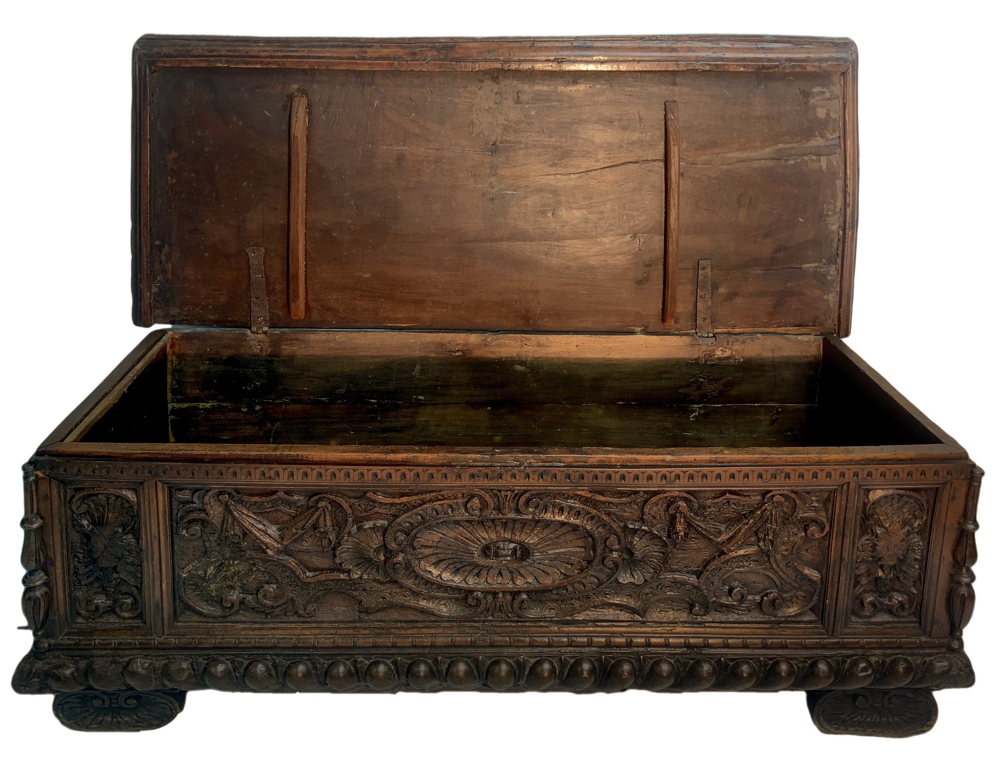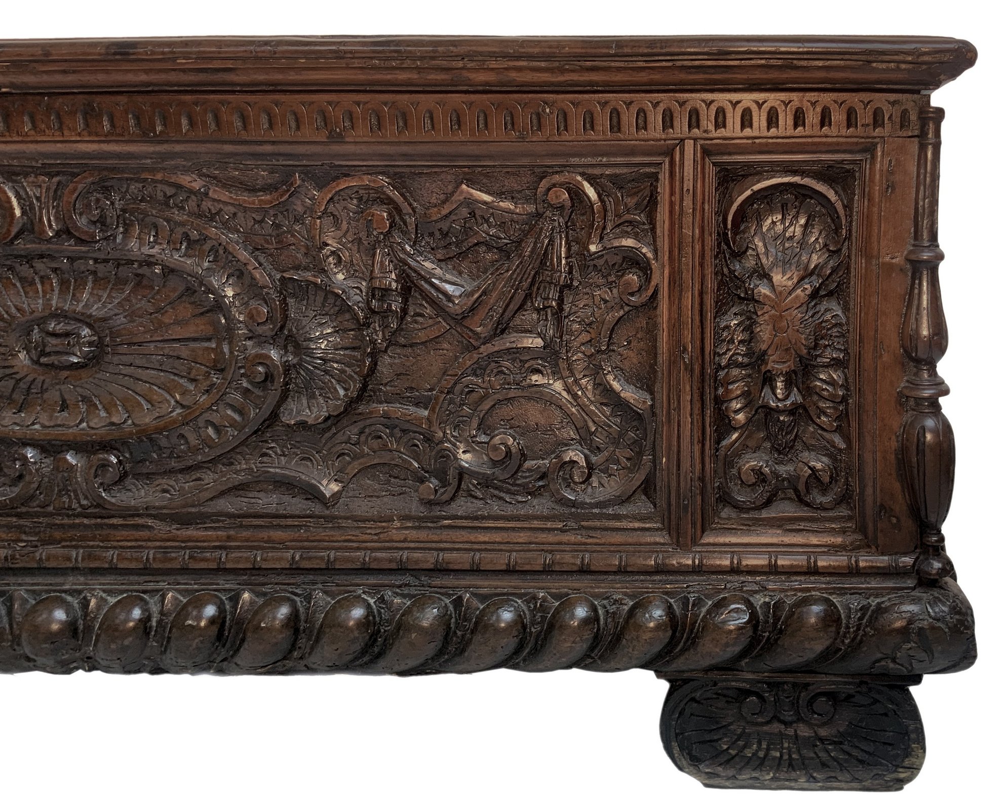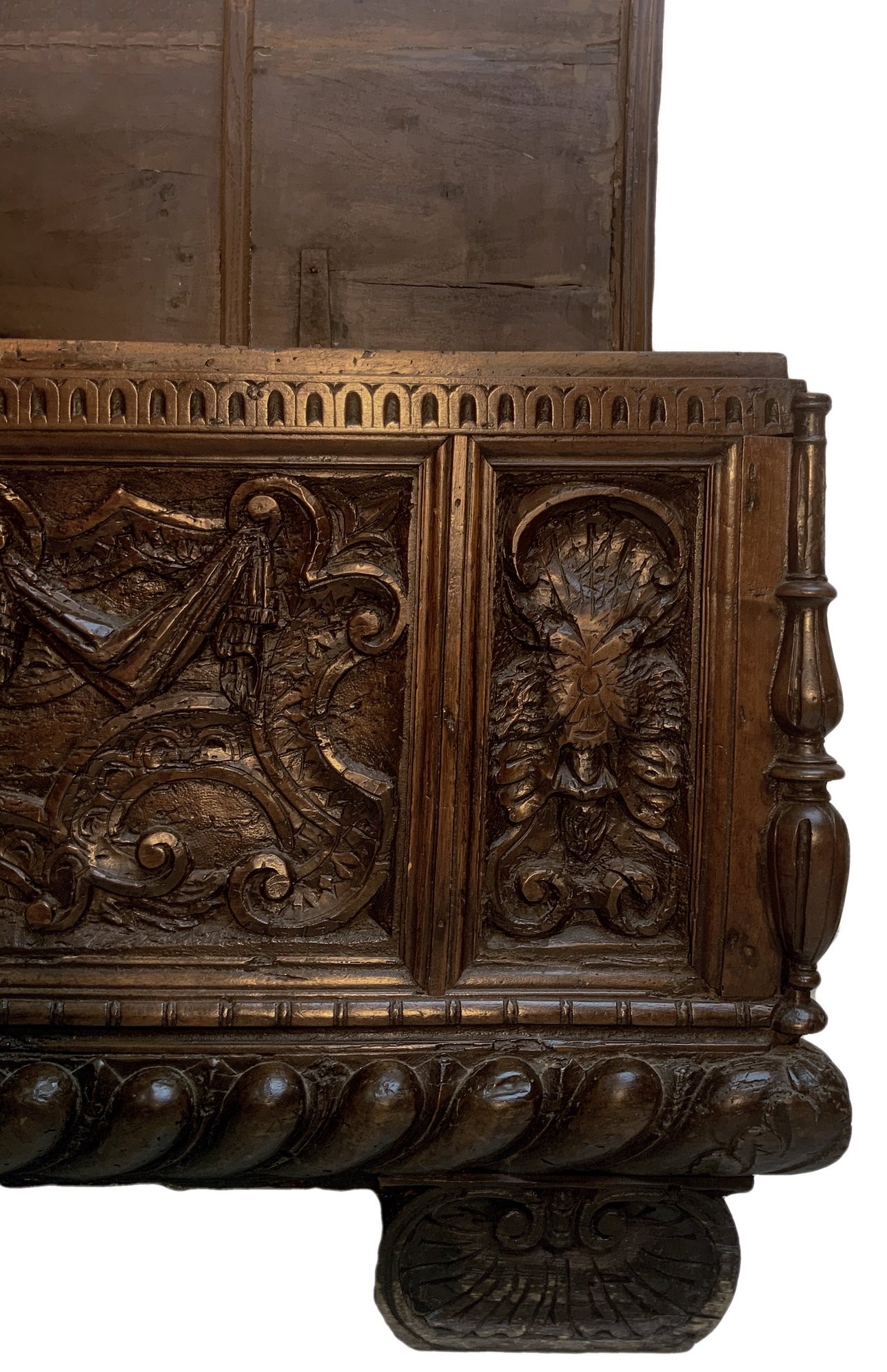 Cassapanca in legno di noce, XVII secolo, Toscana. Scolpita sul fronte con...