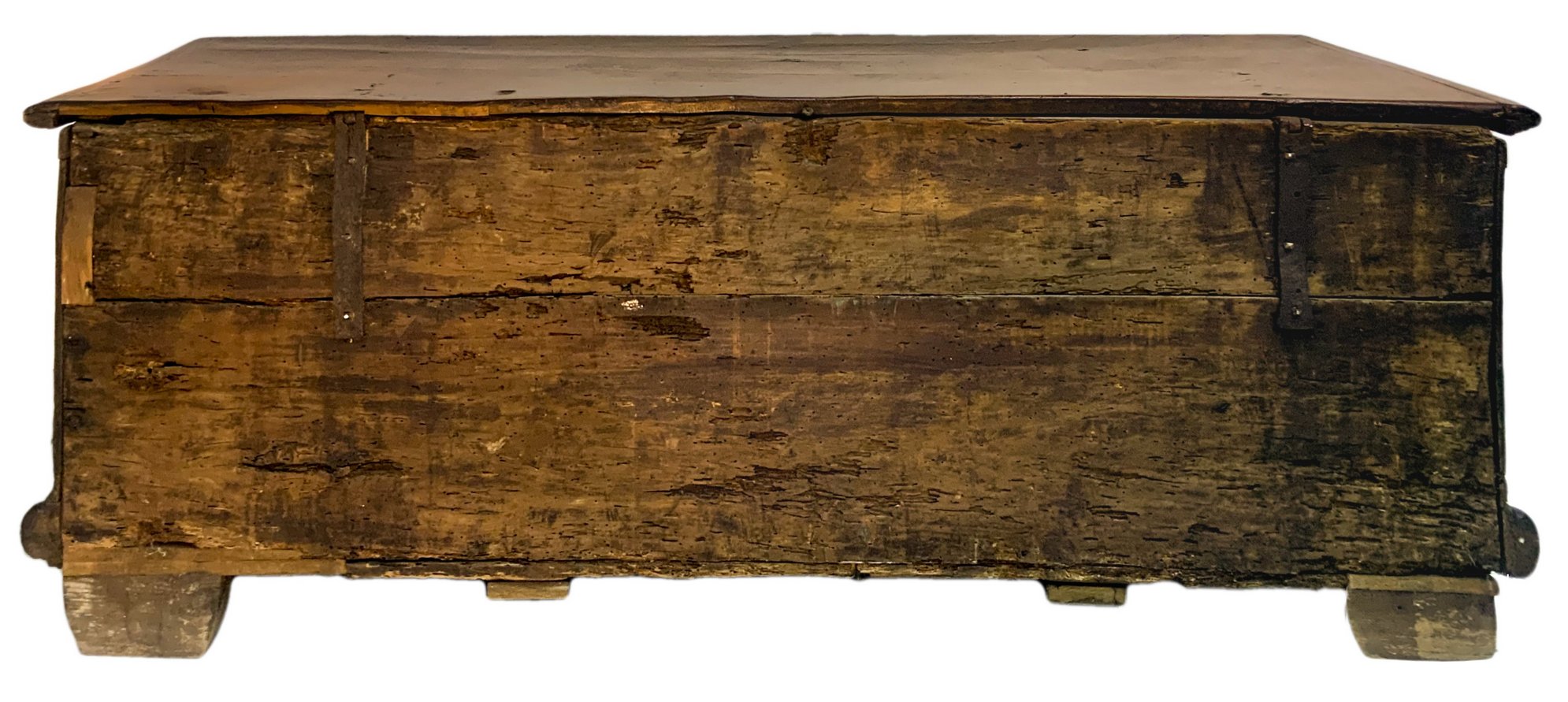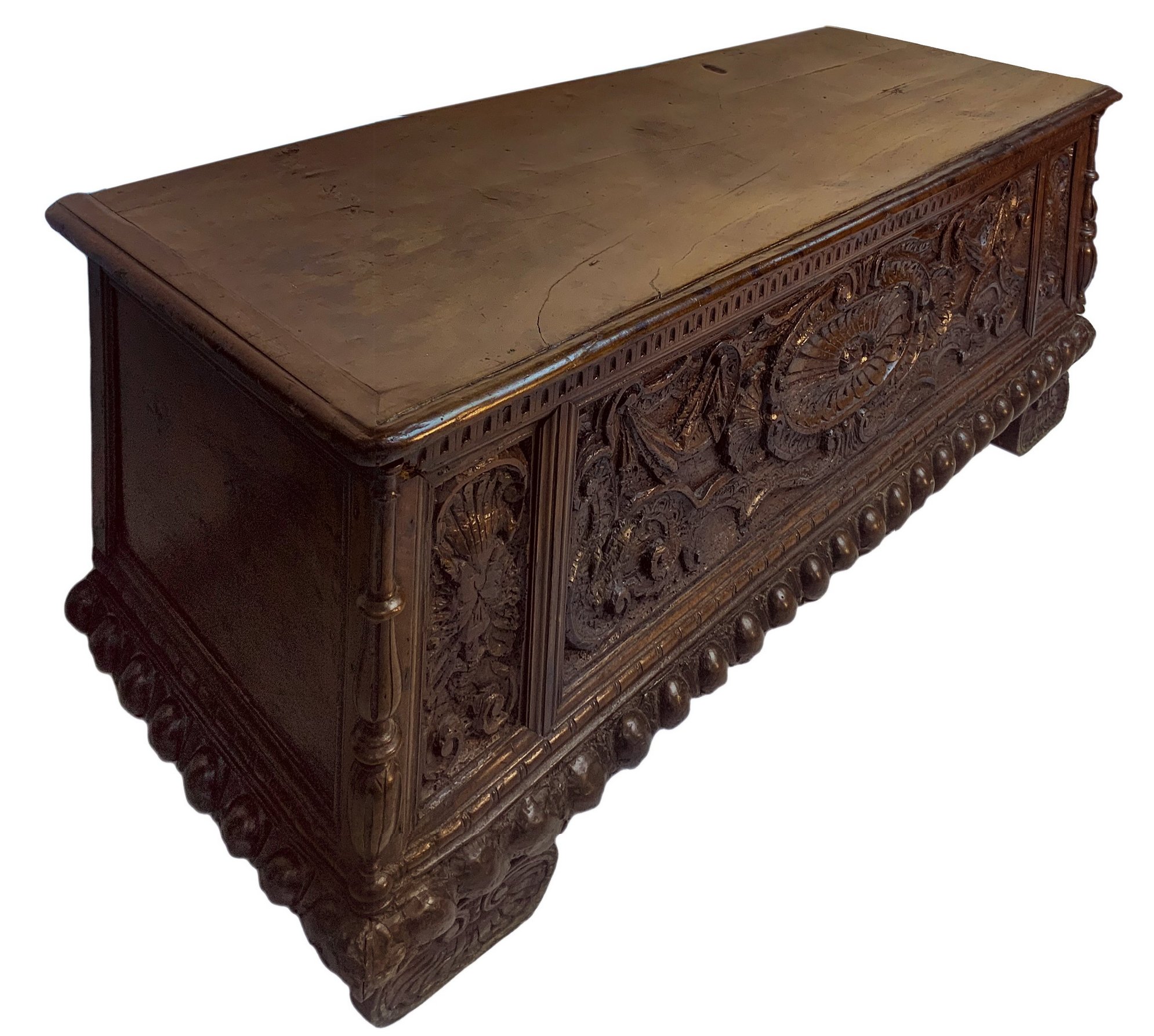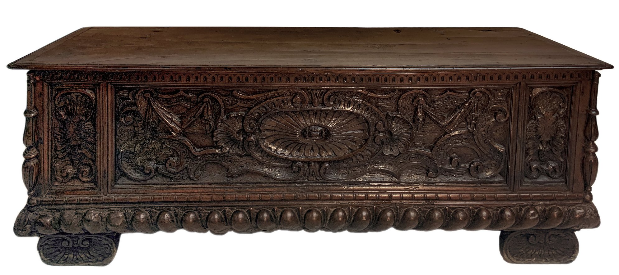 Cassapanca in legno di noce, XVII secolo, Toscana. Scolpita sul fronte con...