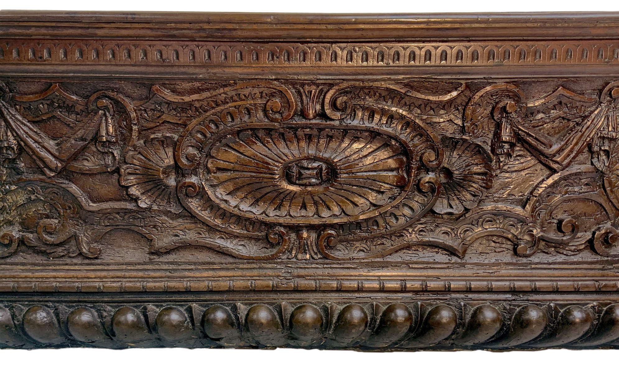 Cassapanca in legno di noce, XVII secolo, Toscana. Scolpita sul fronte con stilemi barocchi, alla base ovuli a goccia. H cm 61 x cm 163x55