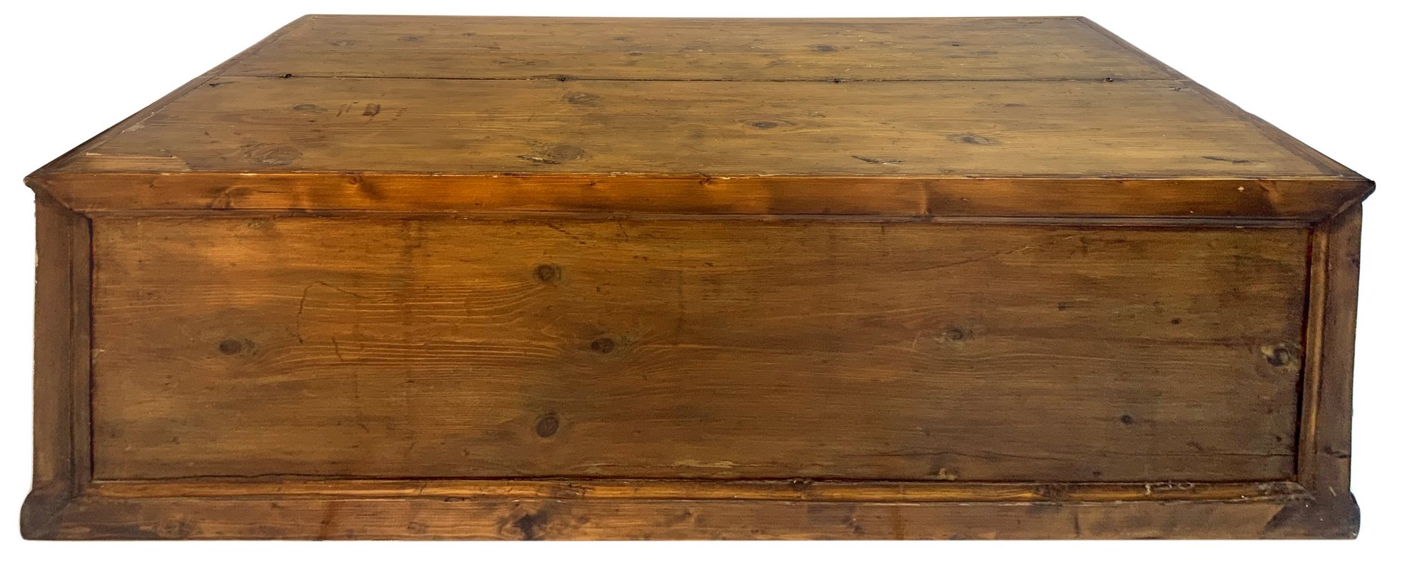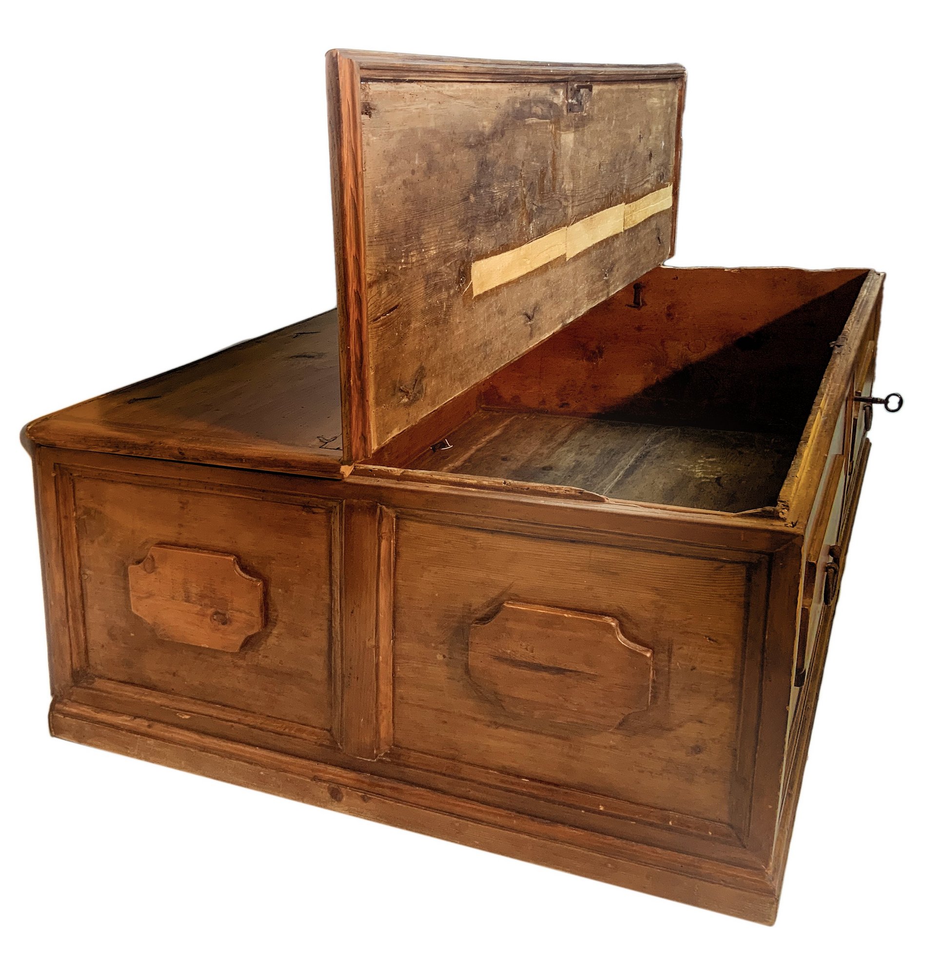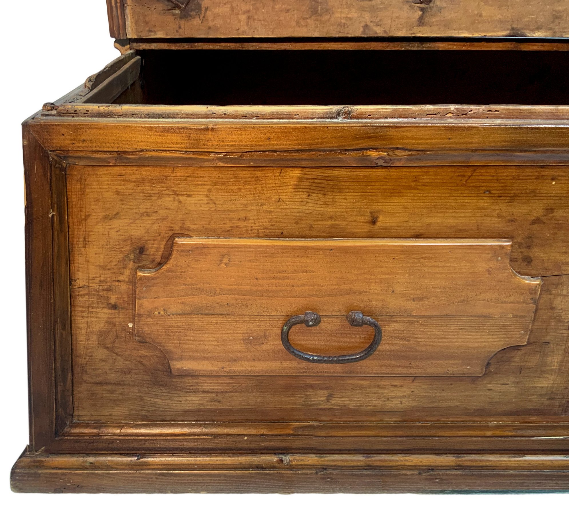 Curula in legno d’abete, fine XVIII secolo, Sicilia. Intagli sui tre lati e maniglie in ferro sul fronte. H cm 50x137x83.