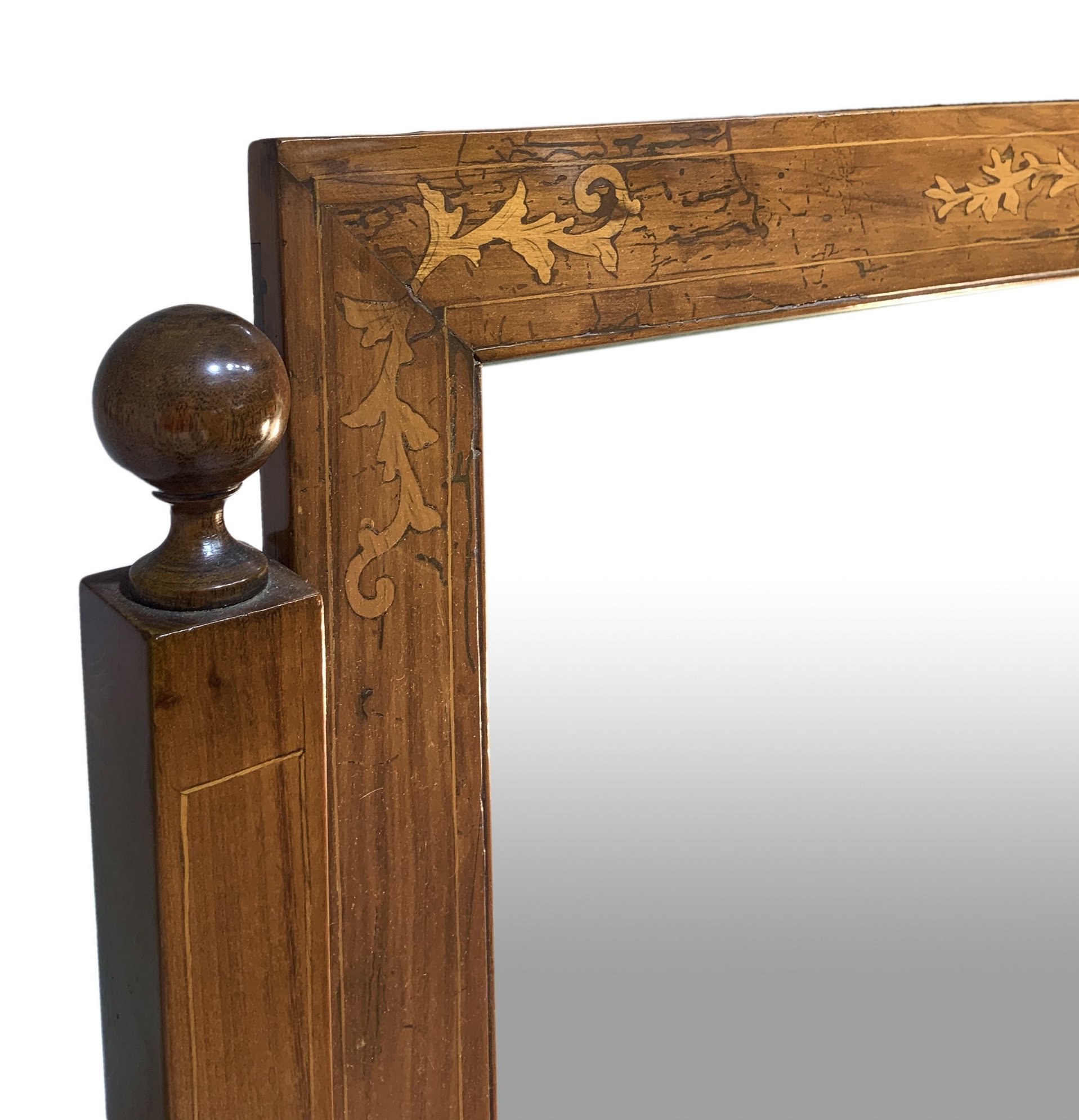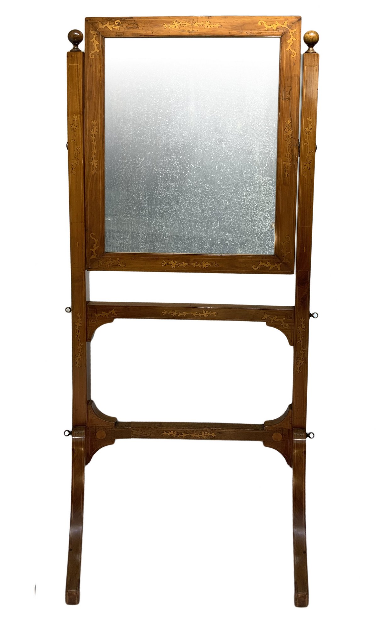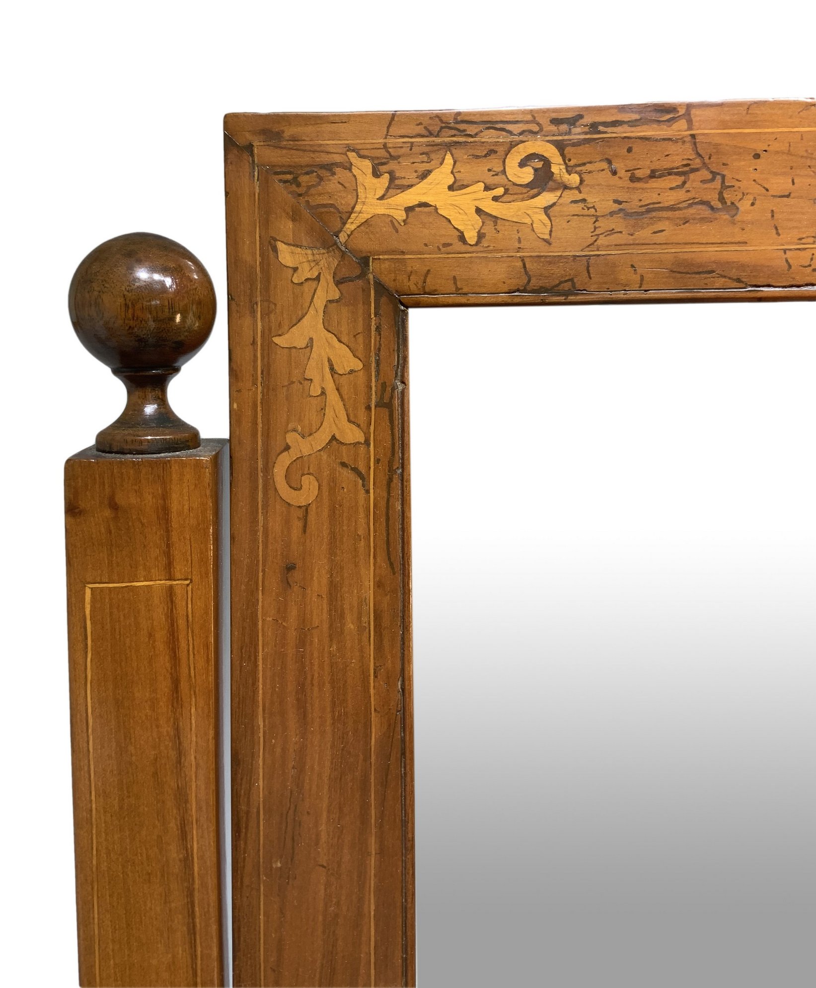 Psiche basculante in legno di noce con intarsi e perfili in legno chiaro. Specchio al mercurio su ambo i lati, fine XVIII/inizi XIX, periodo Direttorio, Sicilia, provenienza famiglia nobliare dei Cerami. H cm 158, cm 73x71.