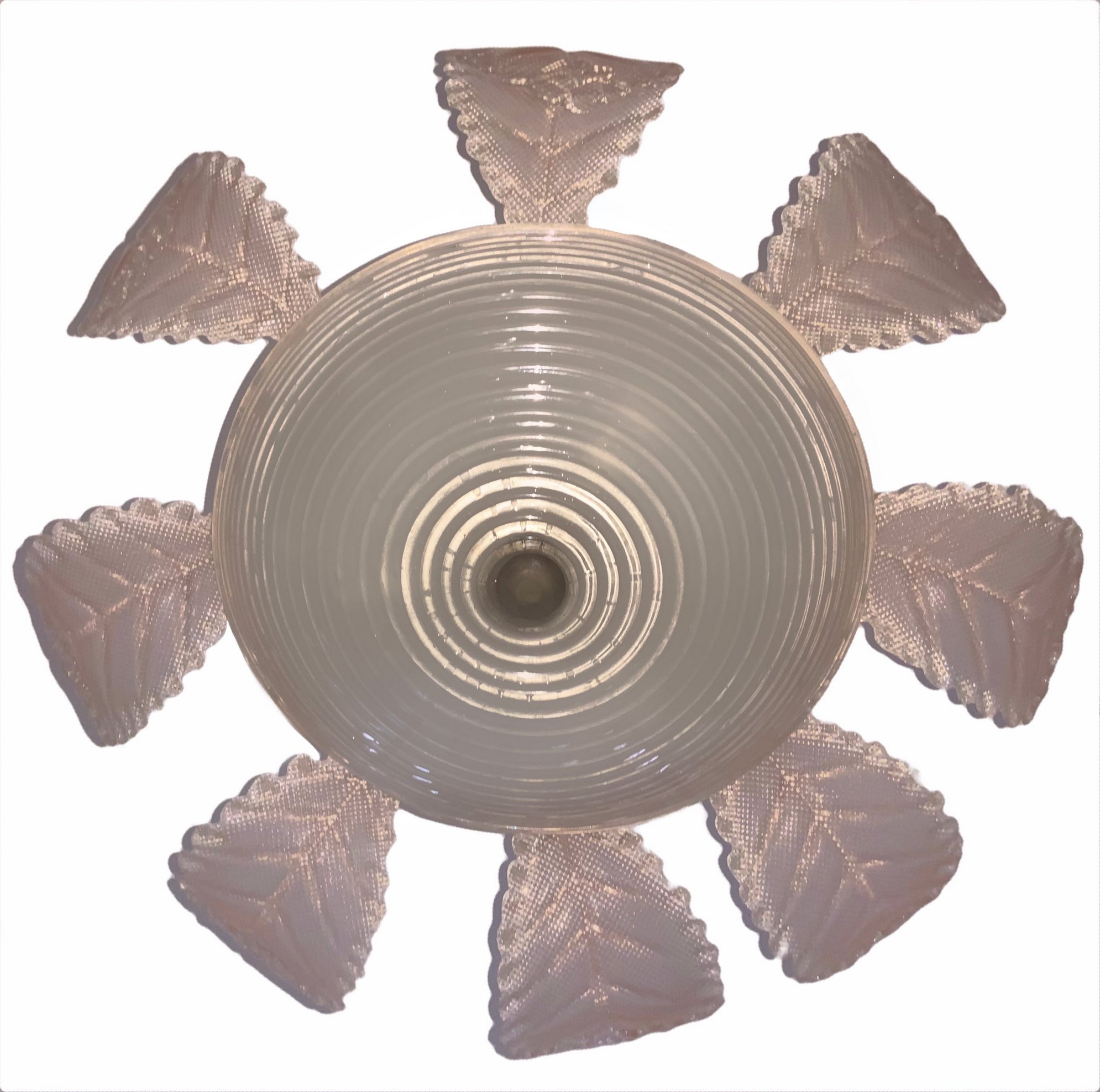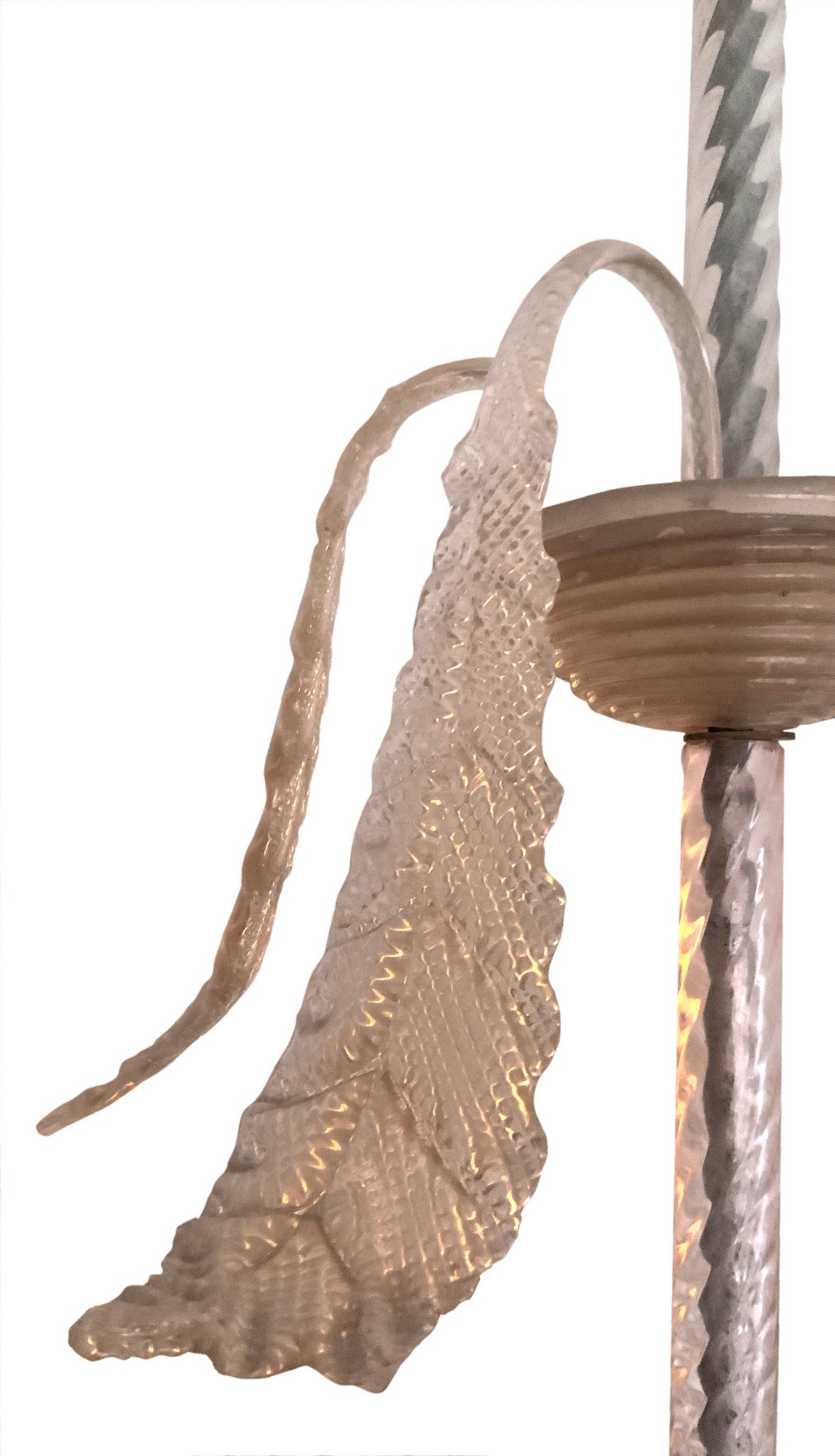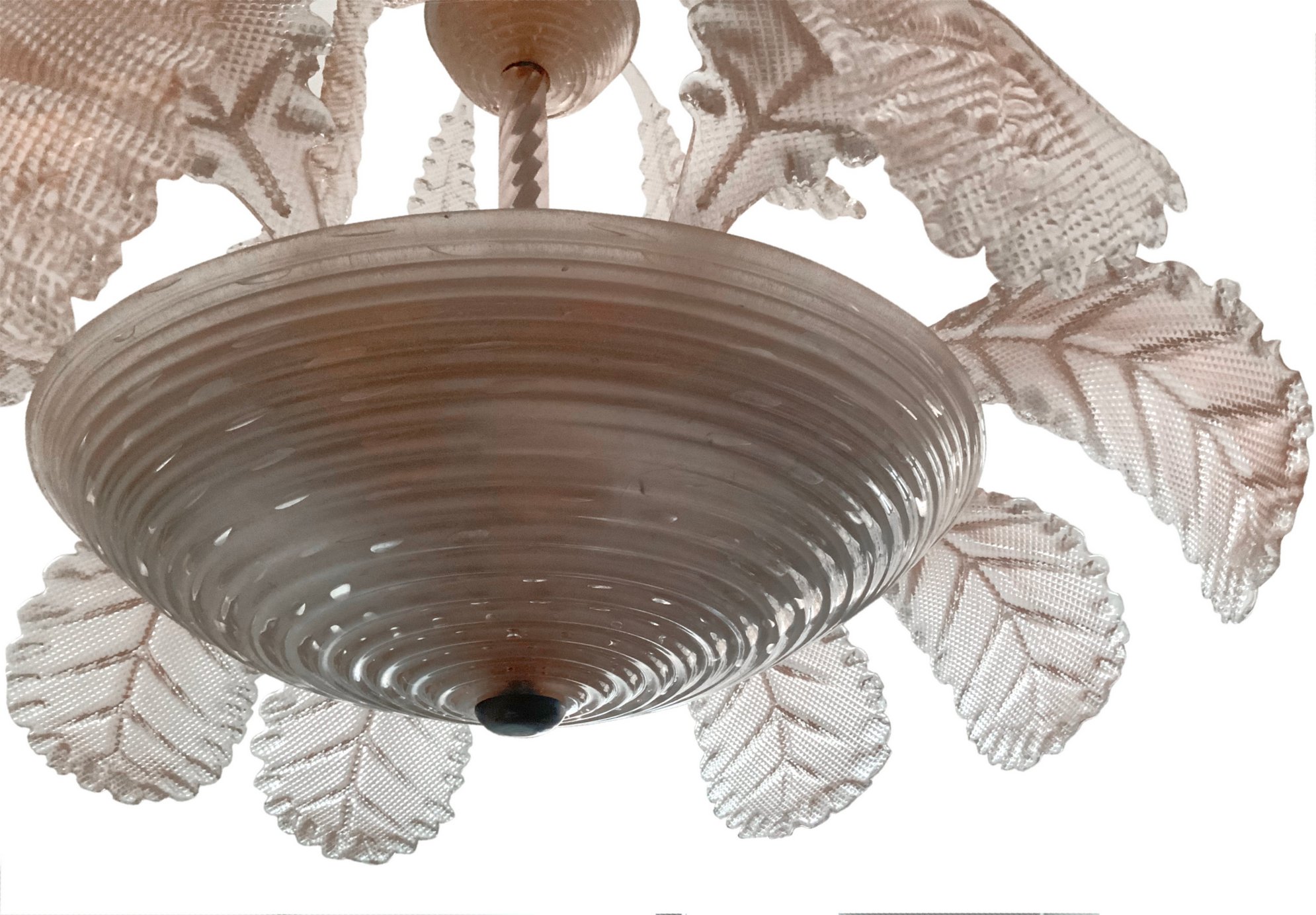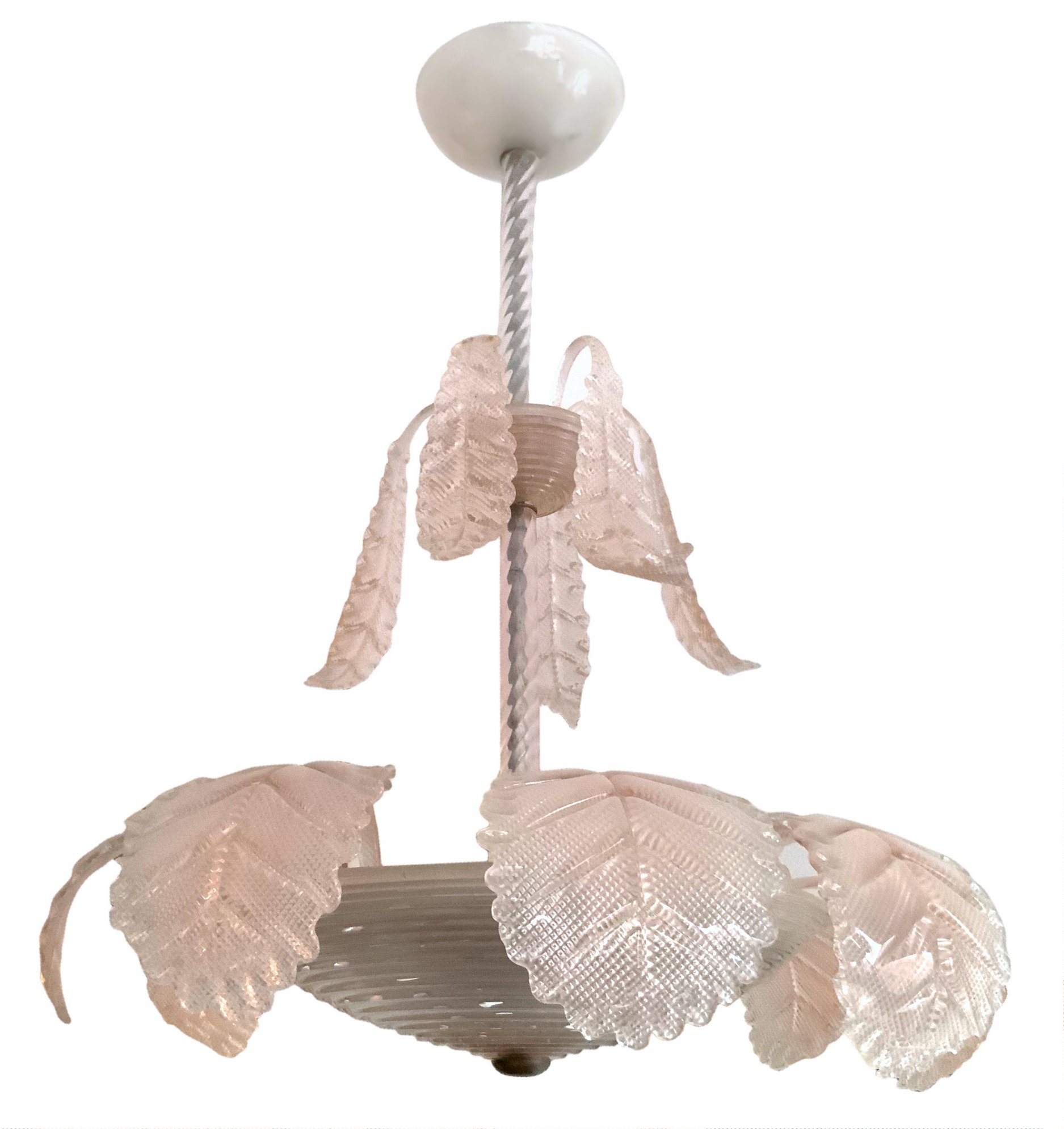 Lampadario in vetro di Murano, color rosa chiaro, anni 40/50. H cm 84, diametro 65.