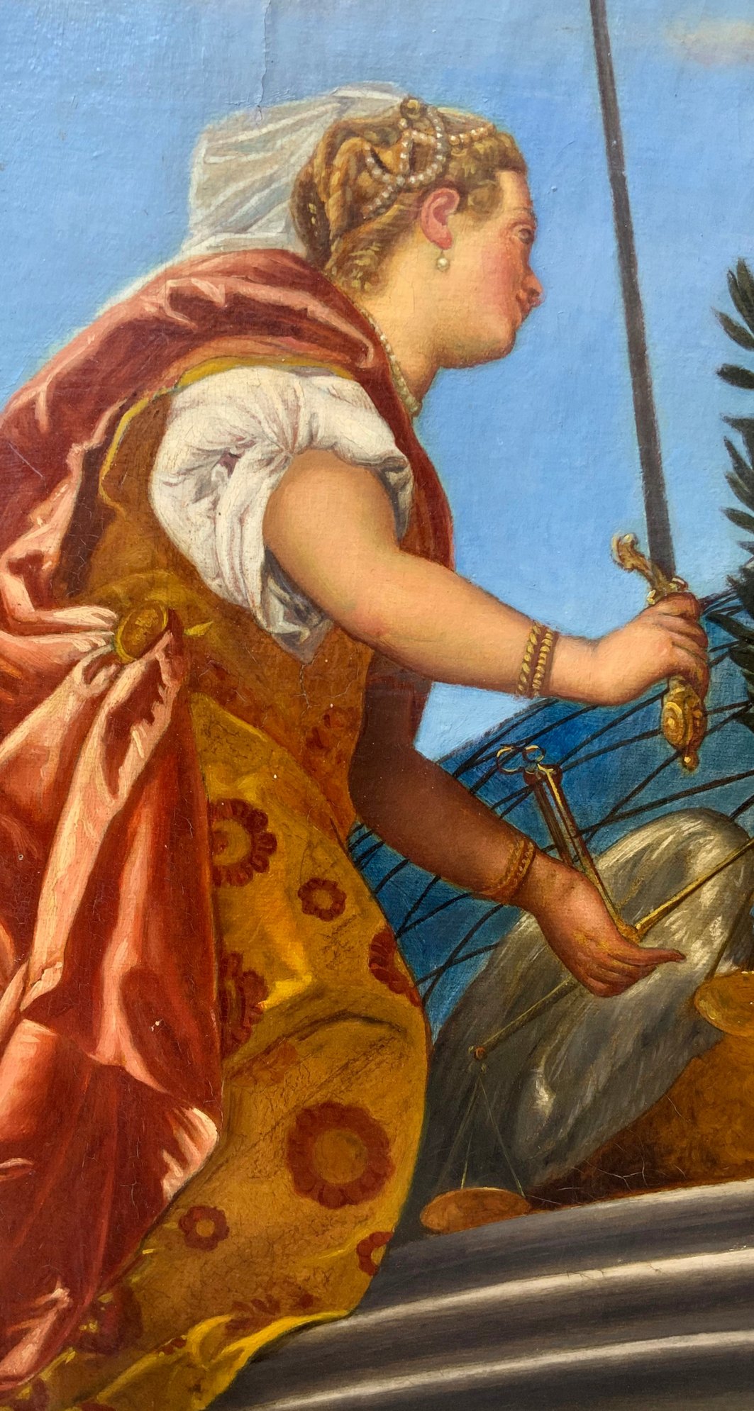 Dipinto olio su tela raffigurante scena allegorica delle virtù cardinali....