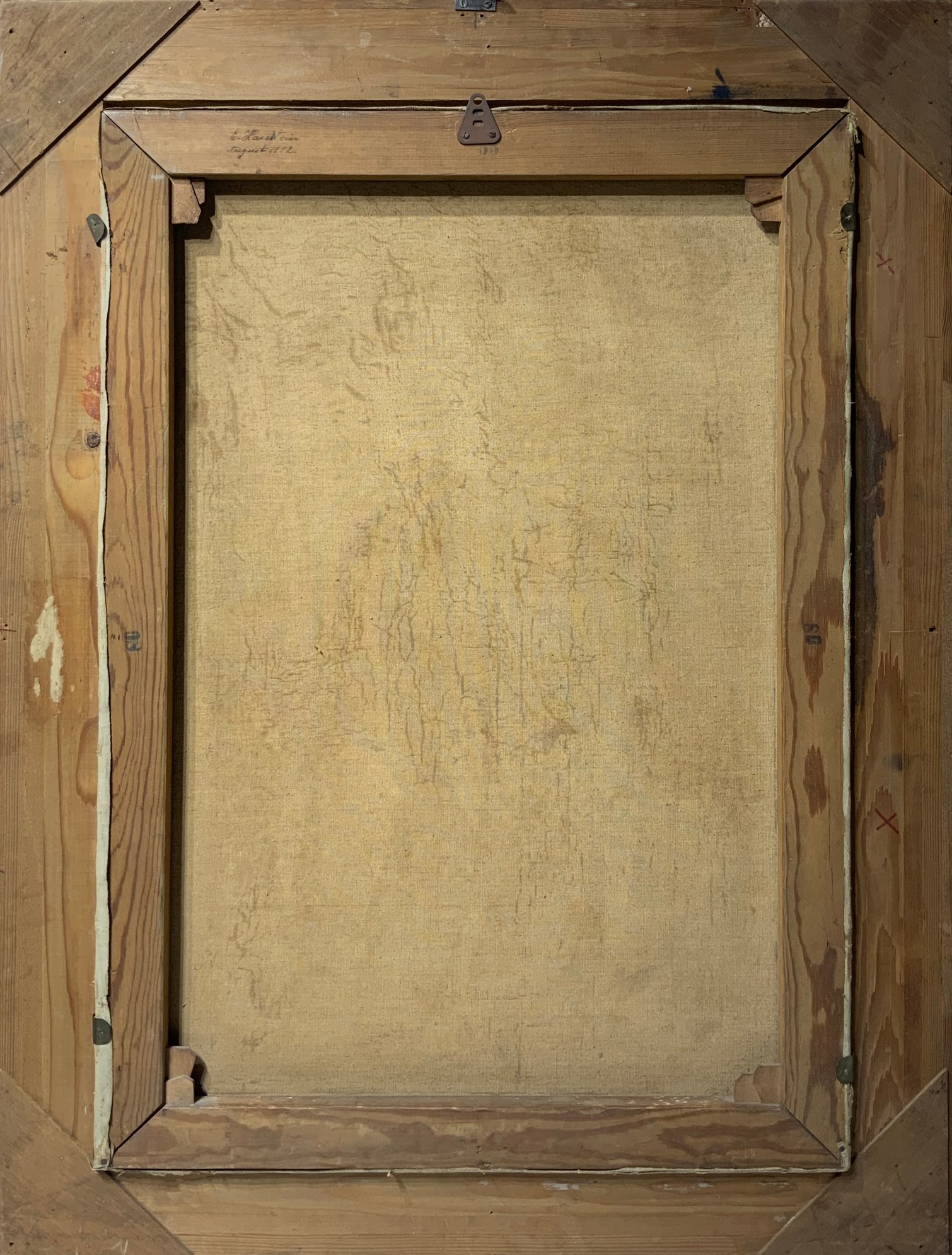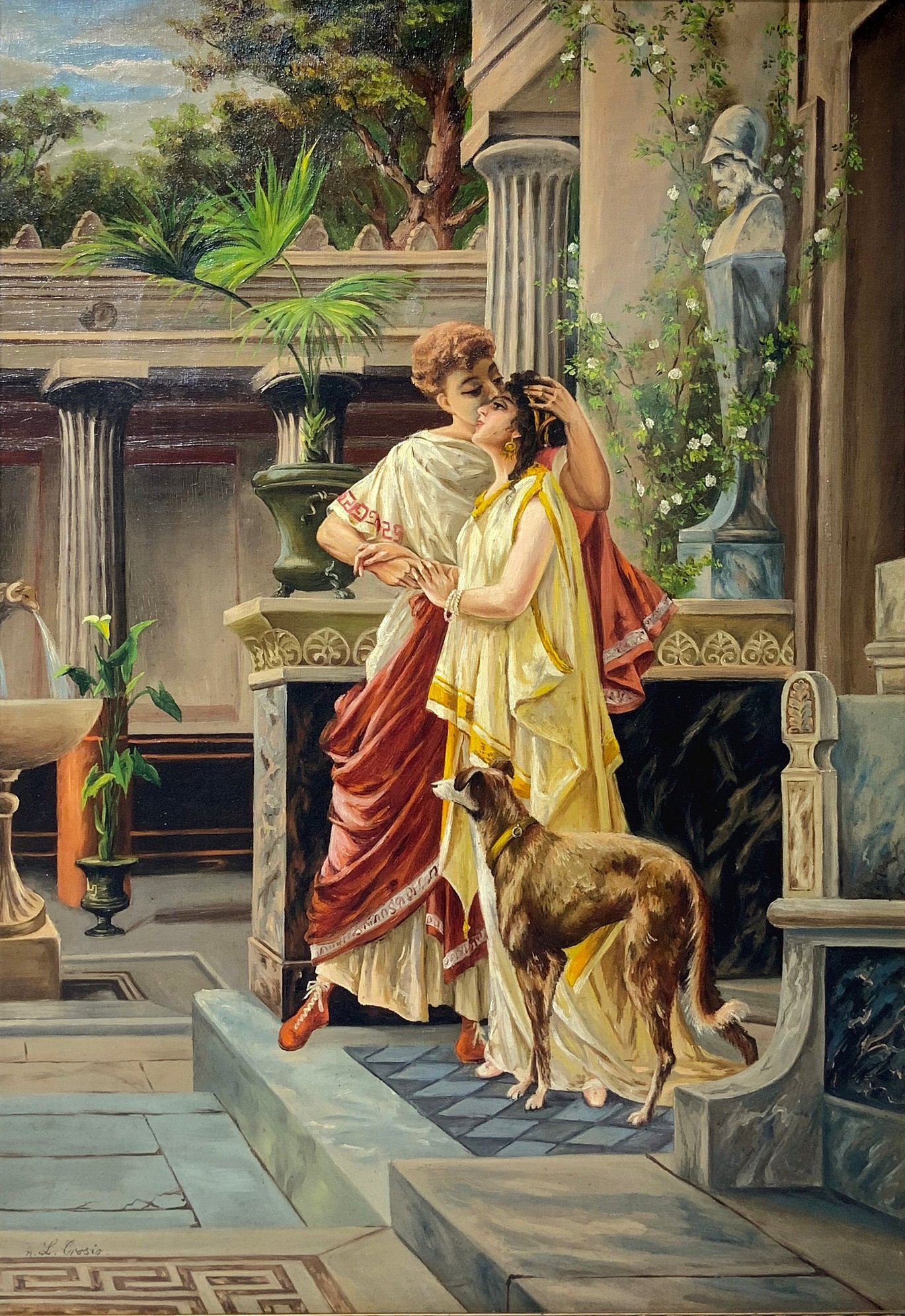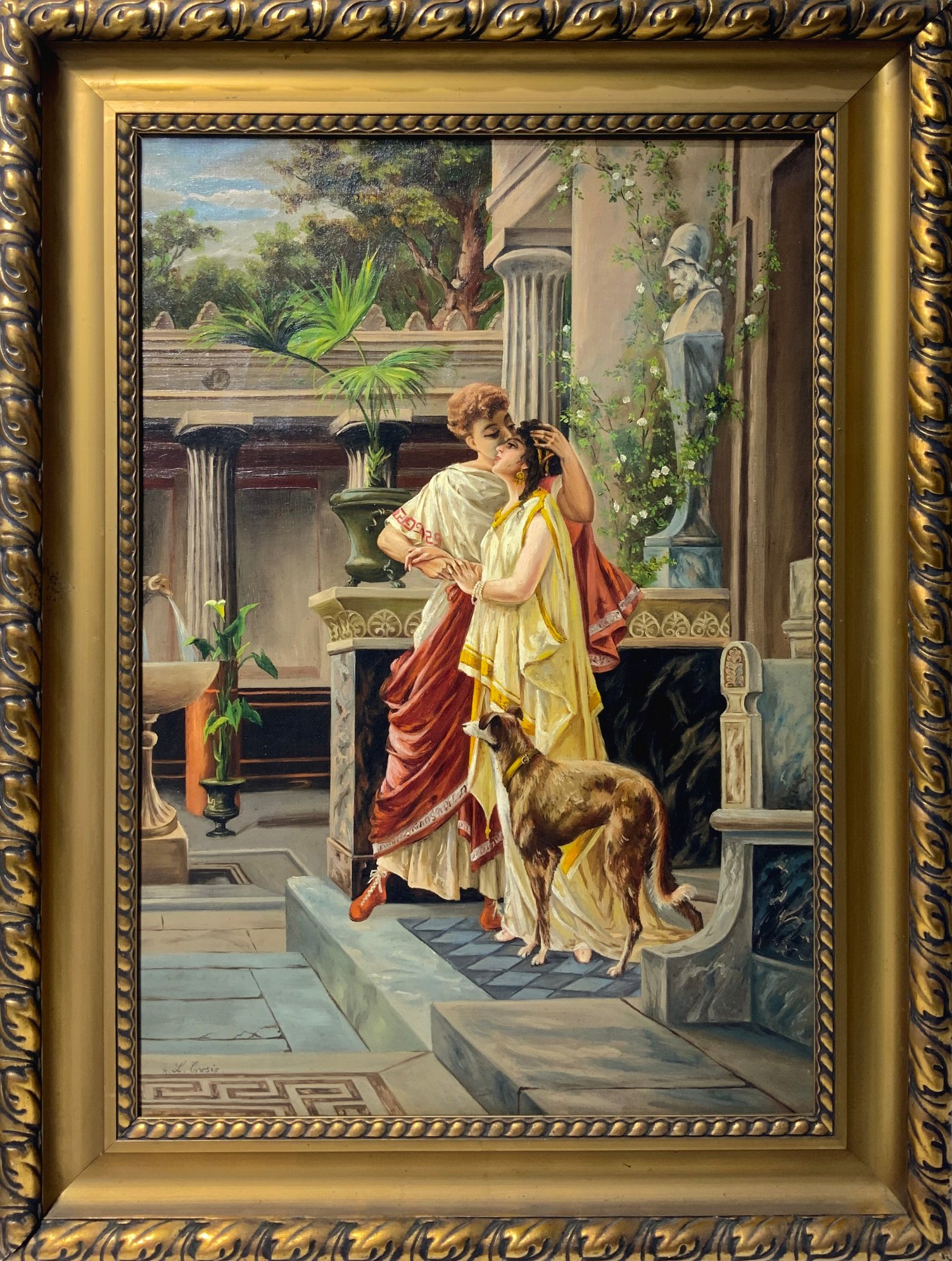 Dipinto olio su tela raffigurante giovani amanti con levriero in vesti pompeiani, XIX secolo. Firmato in basso a sinistra Luigi Crosio (1835-1915). Cm 80x55, in cornice dorata cm 99x73.